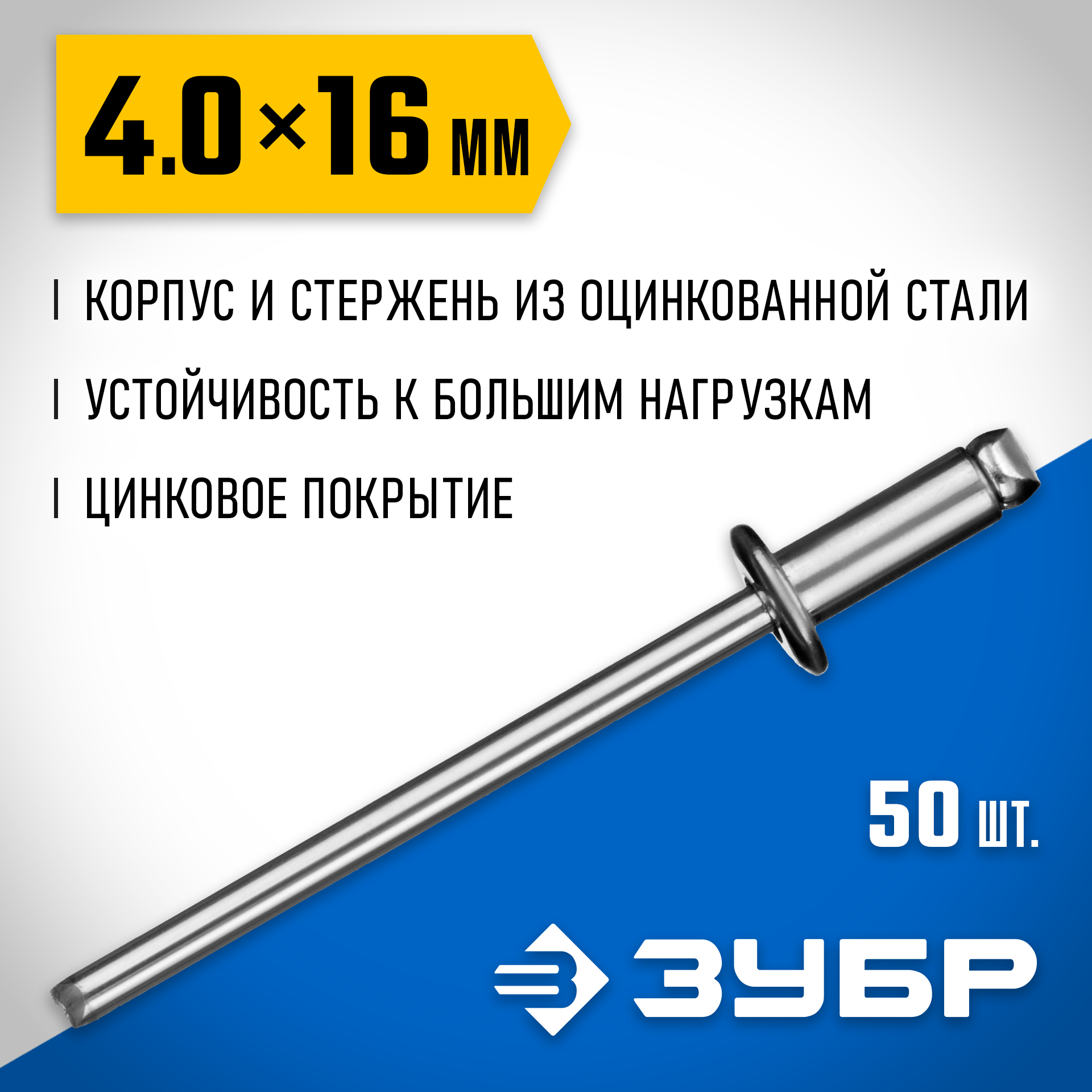 ЗУБР 4.0 х 16 мм, стальные заклепки, 50 шт, ПРОФЕССИОНАЛ (313126-40-16)