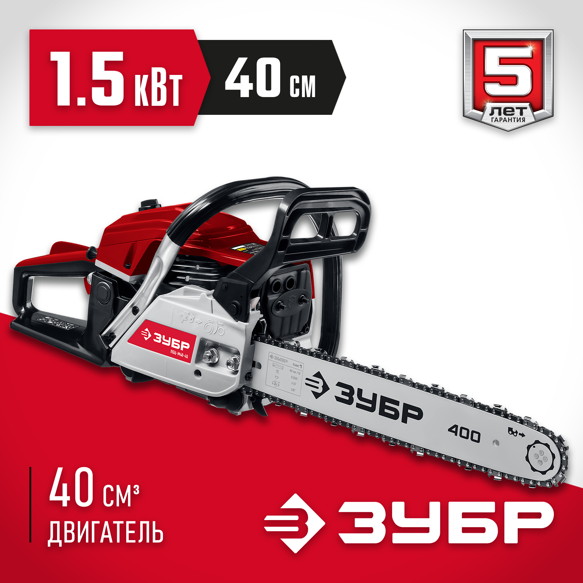 Идеальный вариант для пиления досок, бруса, стволов различных пород дерева на дачном участке. В отличие от электрической, бензиновая пила оснащена более мощным двигателем, безопасна в отношении поражения электрическим током, может работать в любую погоду и в любом месте. Функции легкого запуска, автоматической смазки цепи и эффективная антивибрационная защита делают пилу легкой в обращении и комфортной в работе. Двойной тормоз цепи, приводимый в действие при откидывании защитного щитка или при отпускании клавиши блокировки на рукоятке, а также встроенный цепеуловитель и металлический упор делают пилу безопасной в применении. Большая удельная мощность, высокое качество применяемых материалов и изготовления, обеспечивающие увеличенный ресурс, делают бензиновую пилу ЗУБР Вашим лучшим помощником. Обратите внимание, что рекомендуемая пильная гарнитура ЗУБР устанавливается только комплектом