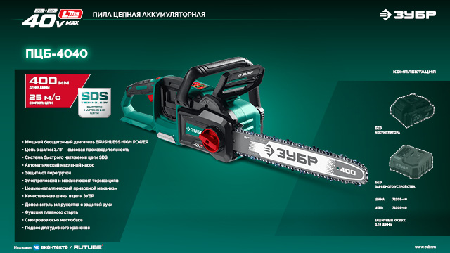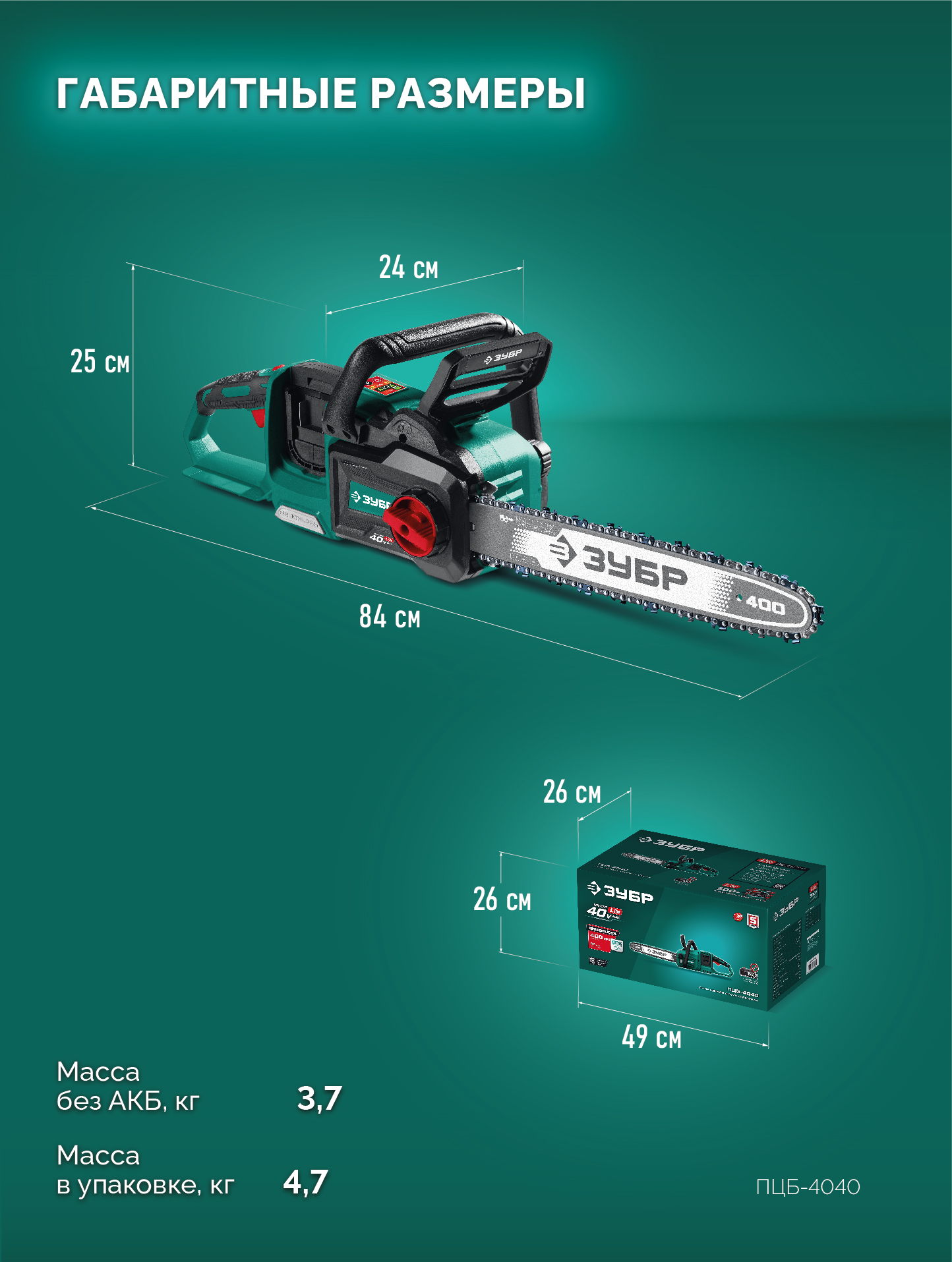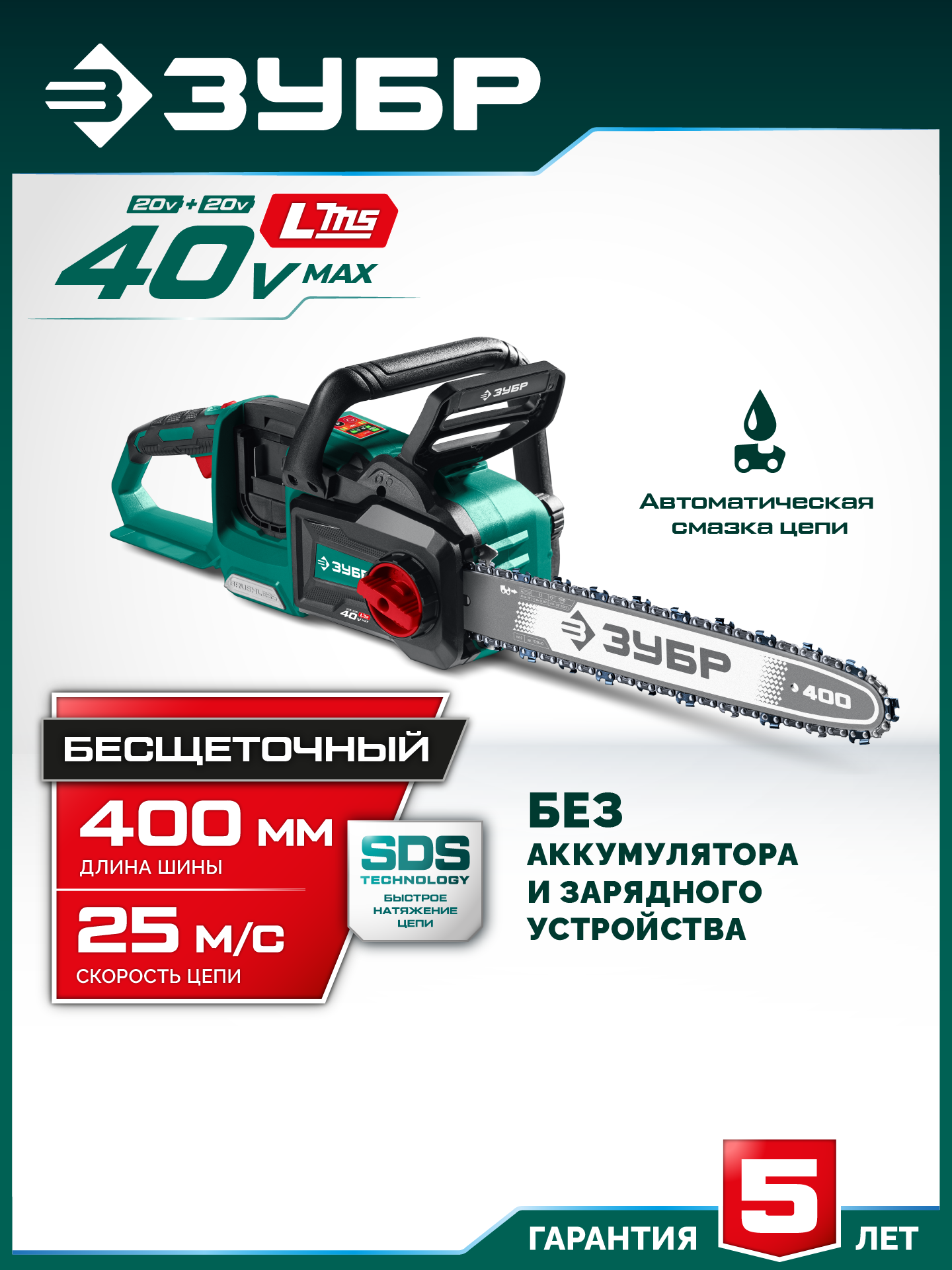 Мощная аккумуляторная цепная пила ЗУБР с напряжением 40В создана для работы в саду, обрезки веток, пиления небольших деревьев, а так же проведения различных строительных и ремонтных работ. Мощный BRUSHLESS двигатель и качественная цепь позволят быстро выполнить работу