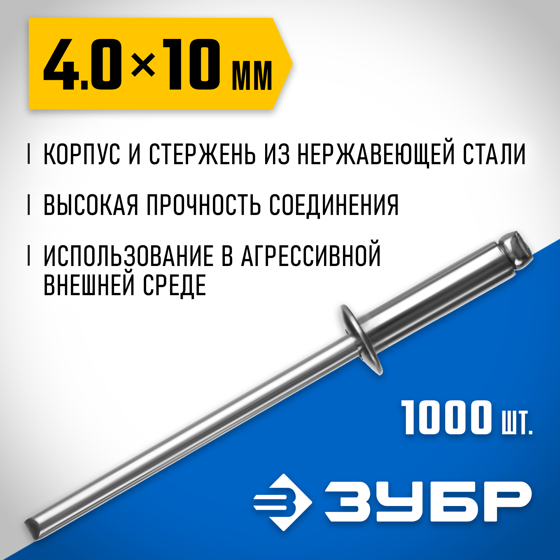 - Корпус и стержень заклепки изготовлены из нержавеющей стали А2 для использования в условиях агрессивной внешней среды: повышенная влажность, осадки, высокие температуры и т.п.