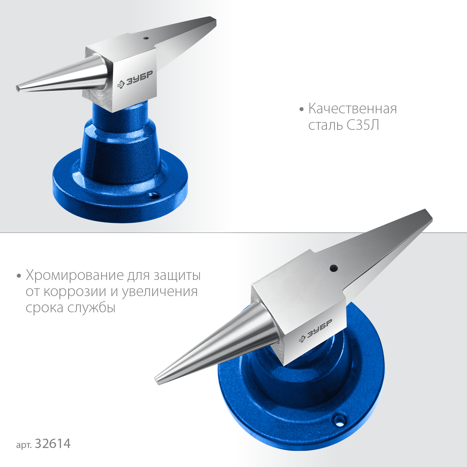 Стальная двурогая наковальня ЗУБР (шперак) для ювелирных работ и работы с проволокой . Антикоррозионное покрытие хромированием Сталь С35Л. Поверхность закалена на глубину 0,8-1,5 мм. Твердость рабочей части HB 340-477. Отверстия Ø3-4 мм для установки инструмента. Увеличенный срок службы. Для точных работ. Серия Профессионал У настольной версии предусмотрены отверстия для жеской фиксации на столе.