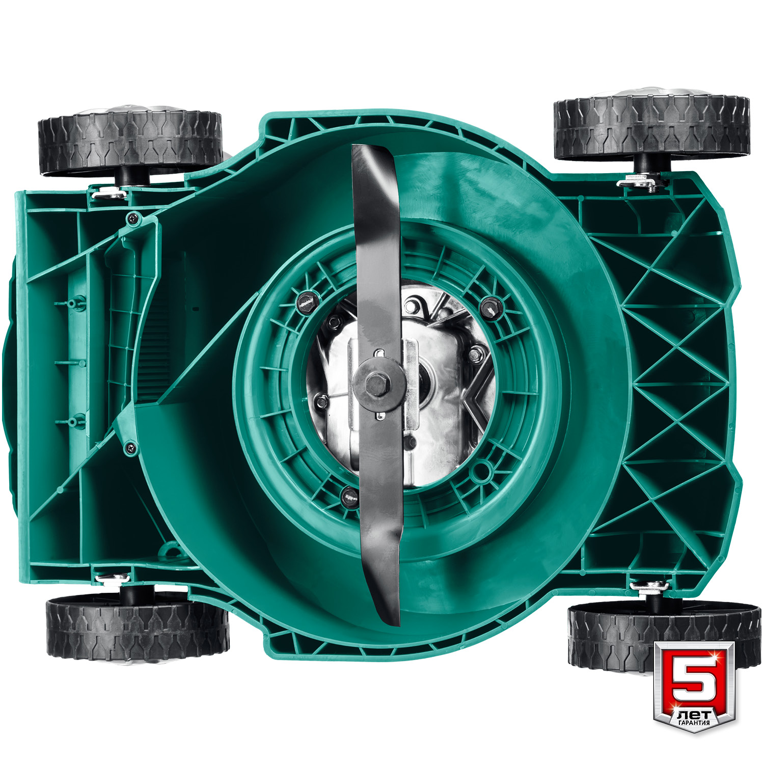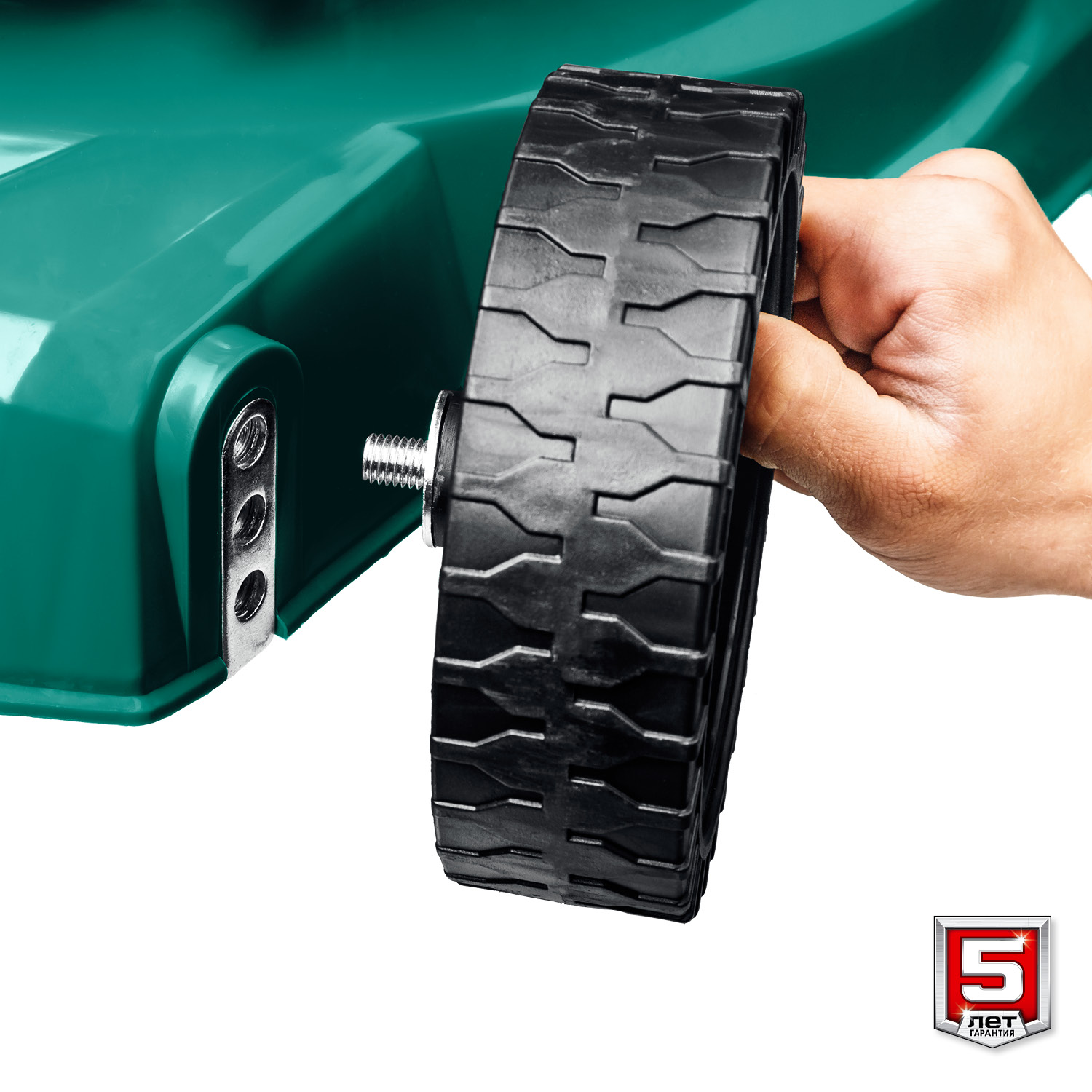 - Колеса увеличенного диаметра на подшипниках и эргономичная рукоятка облегчают перемещение косилки по газону