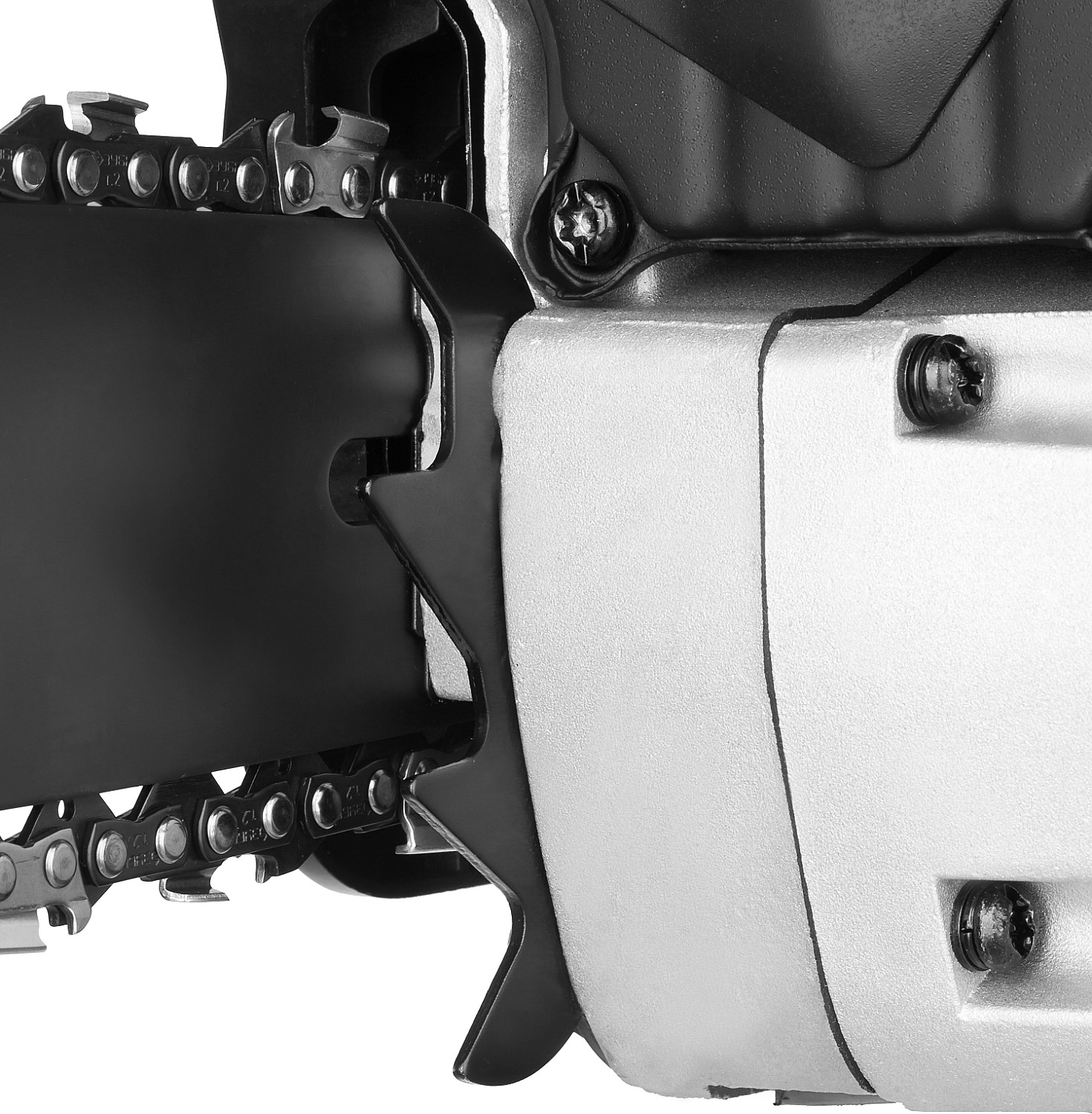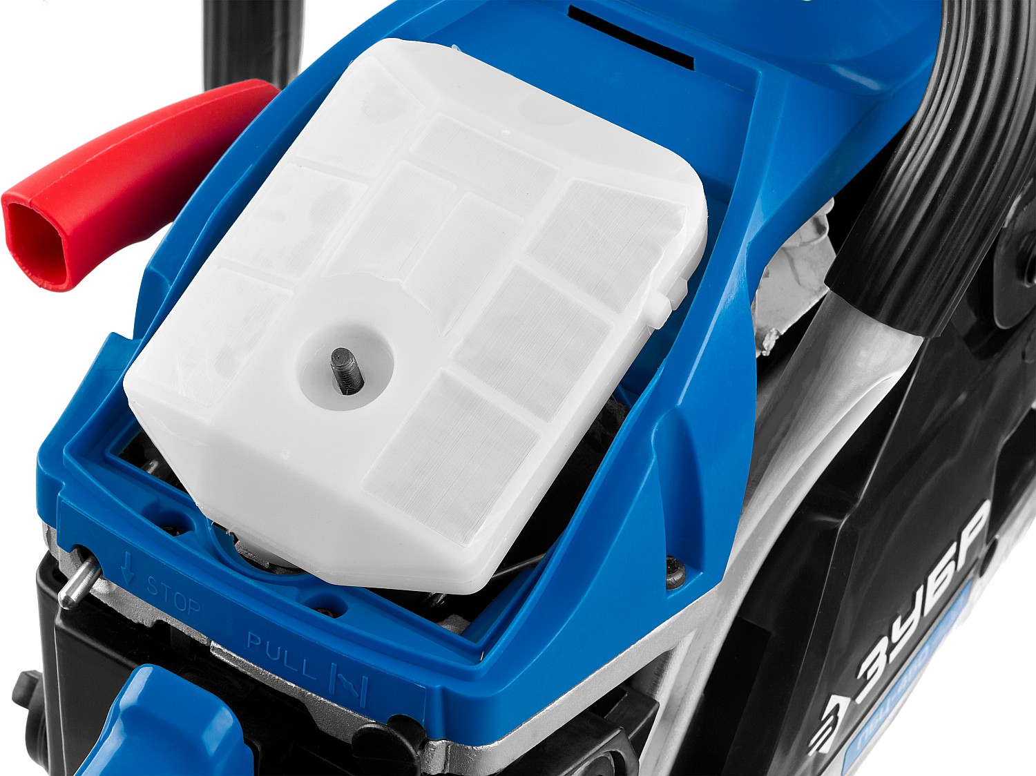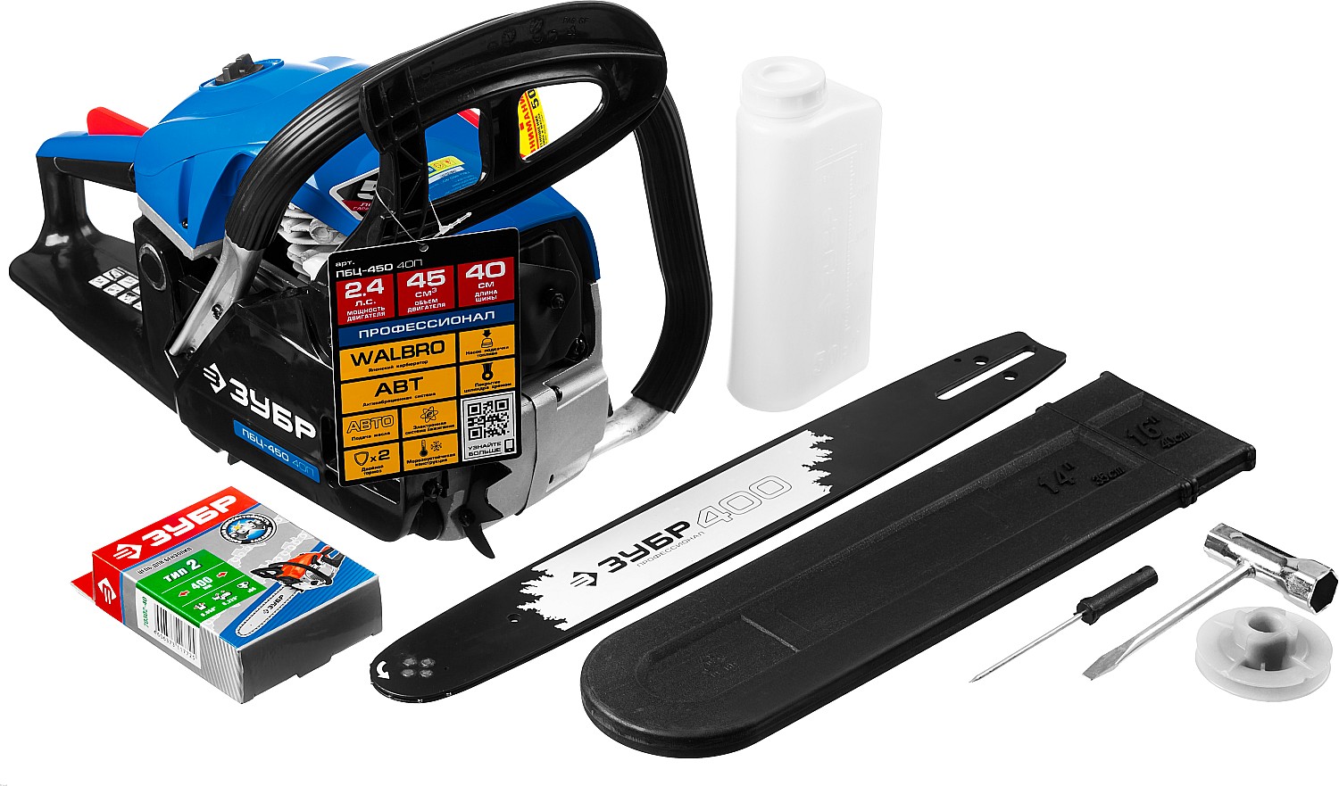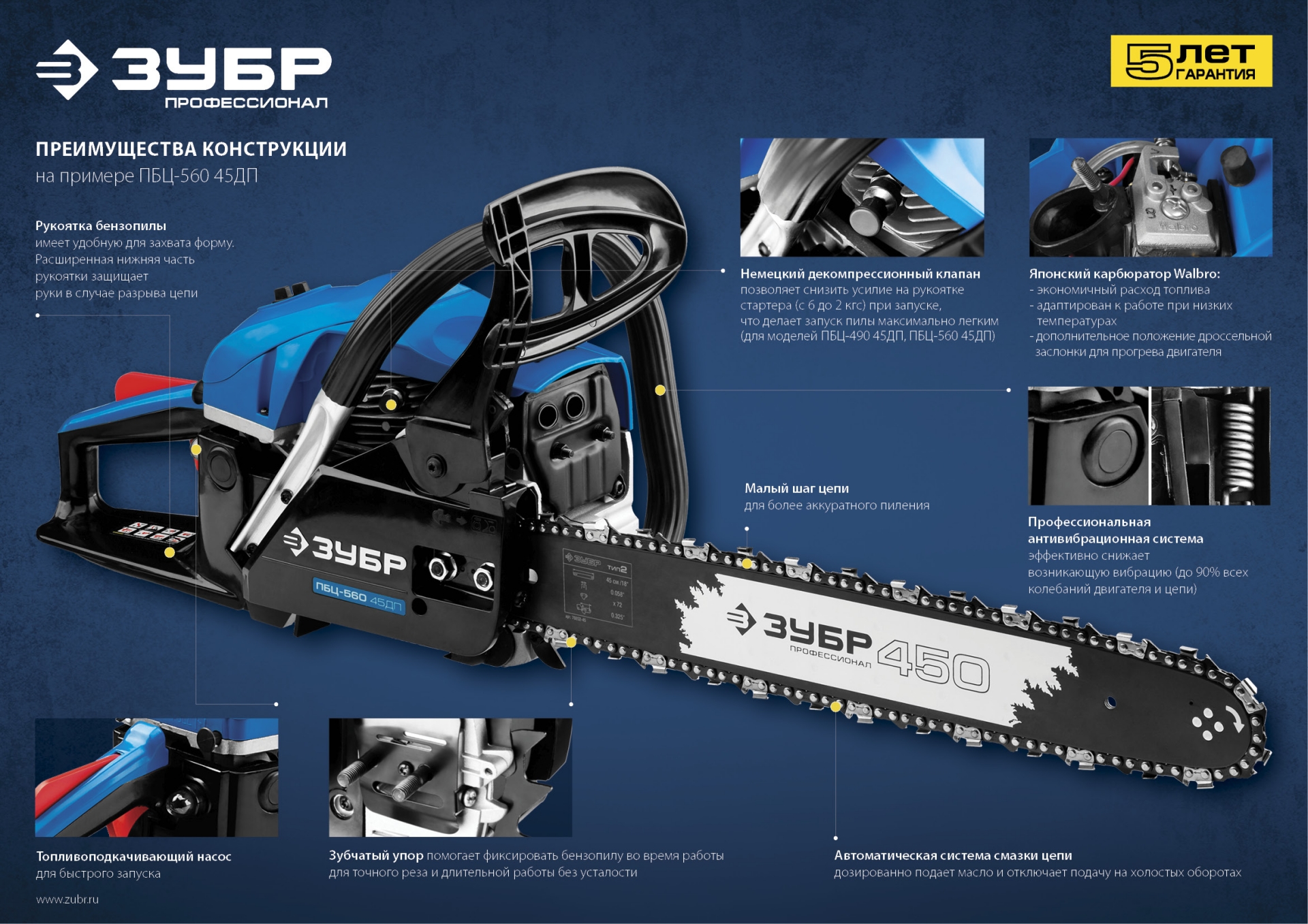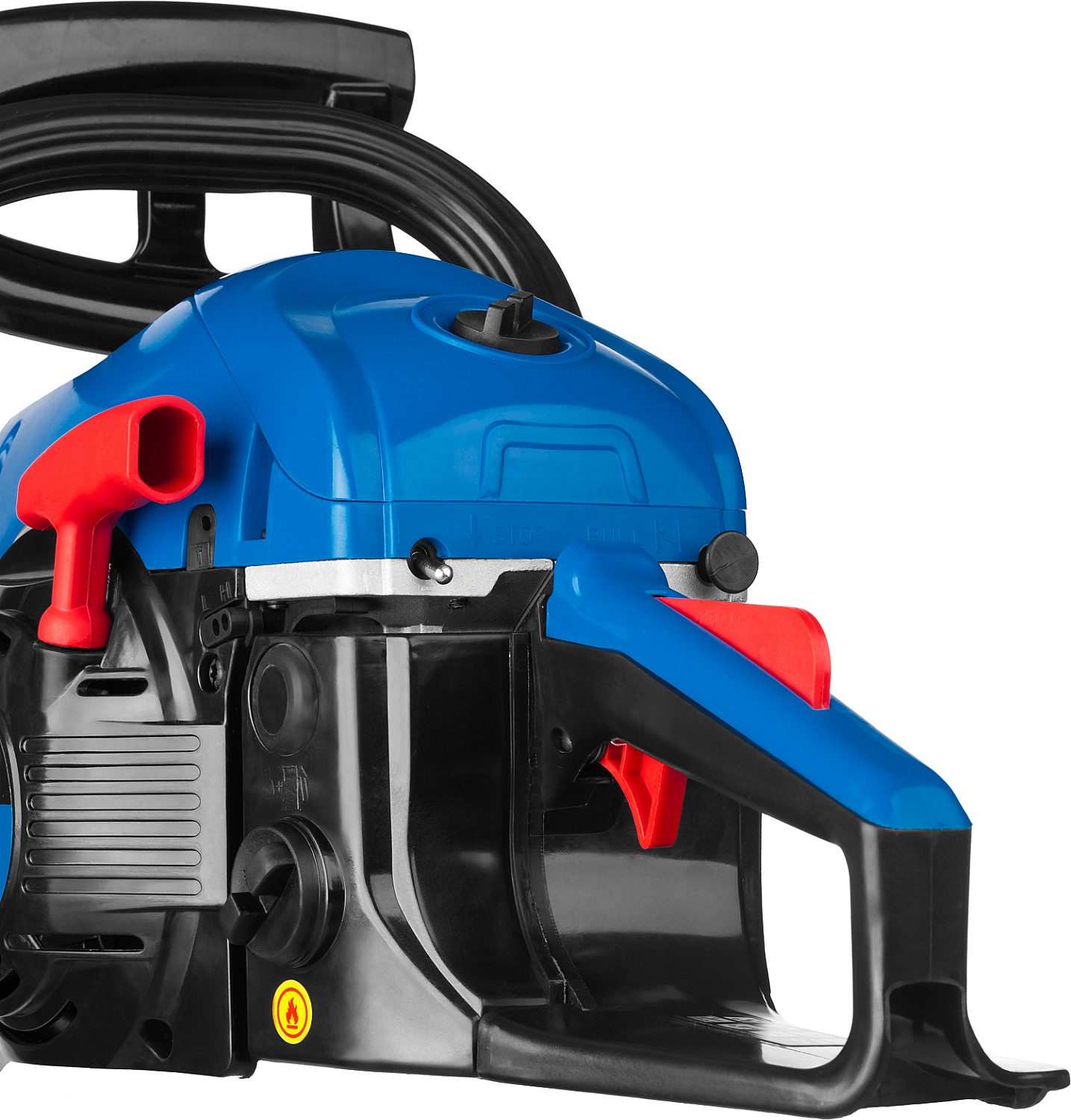 Идеальный вариант для пиления досок, бруса, стволов различных пород дерева на дачном участке. В отличие от электрической, бензиновая пила оснащена более мощным двигателем, безопасна в отношении поражения электрическим током, может работать в любую погоду и в любом месте. Функции легкого запуска, автоматической смазки цепи и эффективная антивибрационная защита делают пилу легкой в обращении и комфортной в работе. Двойной тормоз цепи, приводимый в действие при откидывании защитного щитка или при отпускании клавиши блокировки на рукоятке, а также встроенный цепеуловитель и металлический упор делают пилу безопасной в применении. Большая удельная мощность, высокое качество применяемых материалов и изготовления, обеспечивающие увеличенный ресурс, делают бензиновую пилу ЗУБР Вашим лучшим помощником