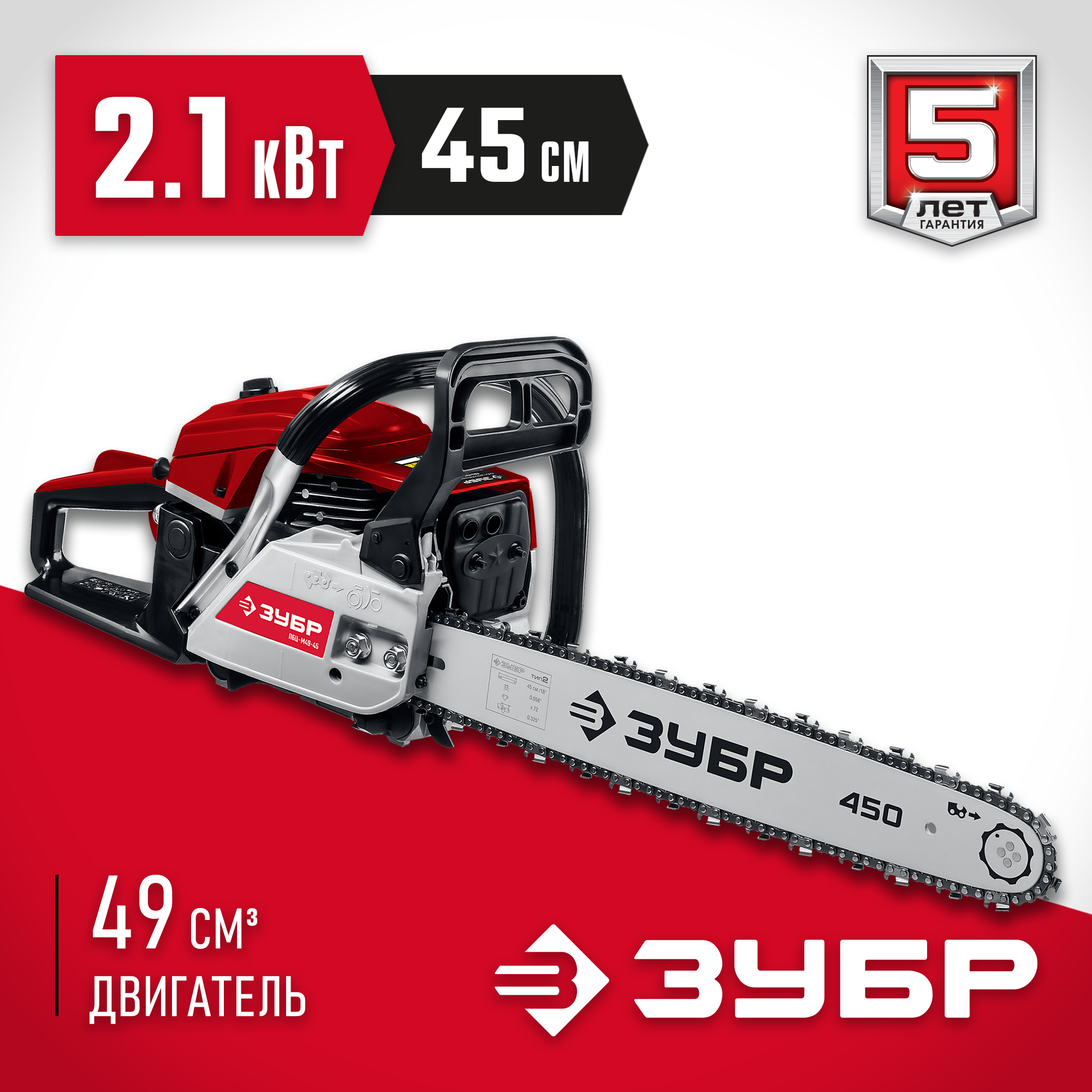 Идеальный вариант для пиления досок, бруса, стволов различных пород дерева на дачном участке. В отличие от электрической, бензиновая пила оснащена более мощным двигателем, безопасна в отношении поражения электрическим током, может работать в любую погоду и в любом месте. Функции легкого запуска, автоматической смазки цепи и эффективная антивибрационная защита делают пилу легкой в обращении и комфортной в работе. Двойной тормоз цепи, приводимый в действие при откидывании защитного щитка или при отпускании клавиши блокировки на рукоятке, а также встроенный цепеуловитель и металлический упор делают пилу безопасной в применении. Большая удельная мощность, высокое качество применяемых материалов и изготовления, обеспечивающие увеличенный ресурс, делают бензиновую пилу ЗУБР Вашим лучшим помощником. Обратите внимание, что рекомендуемая пильная гарнитура ЗУБР устанавливается только комплектом