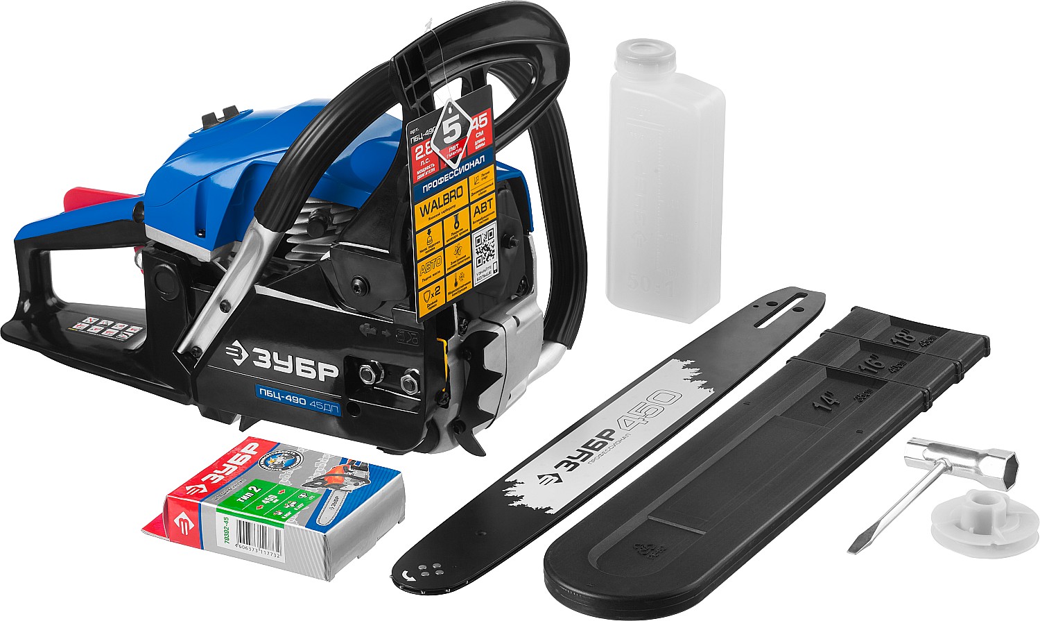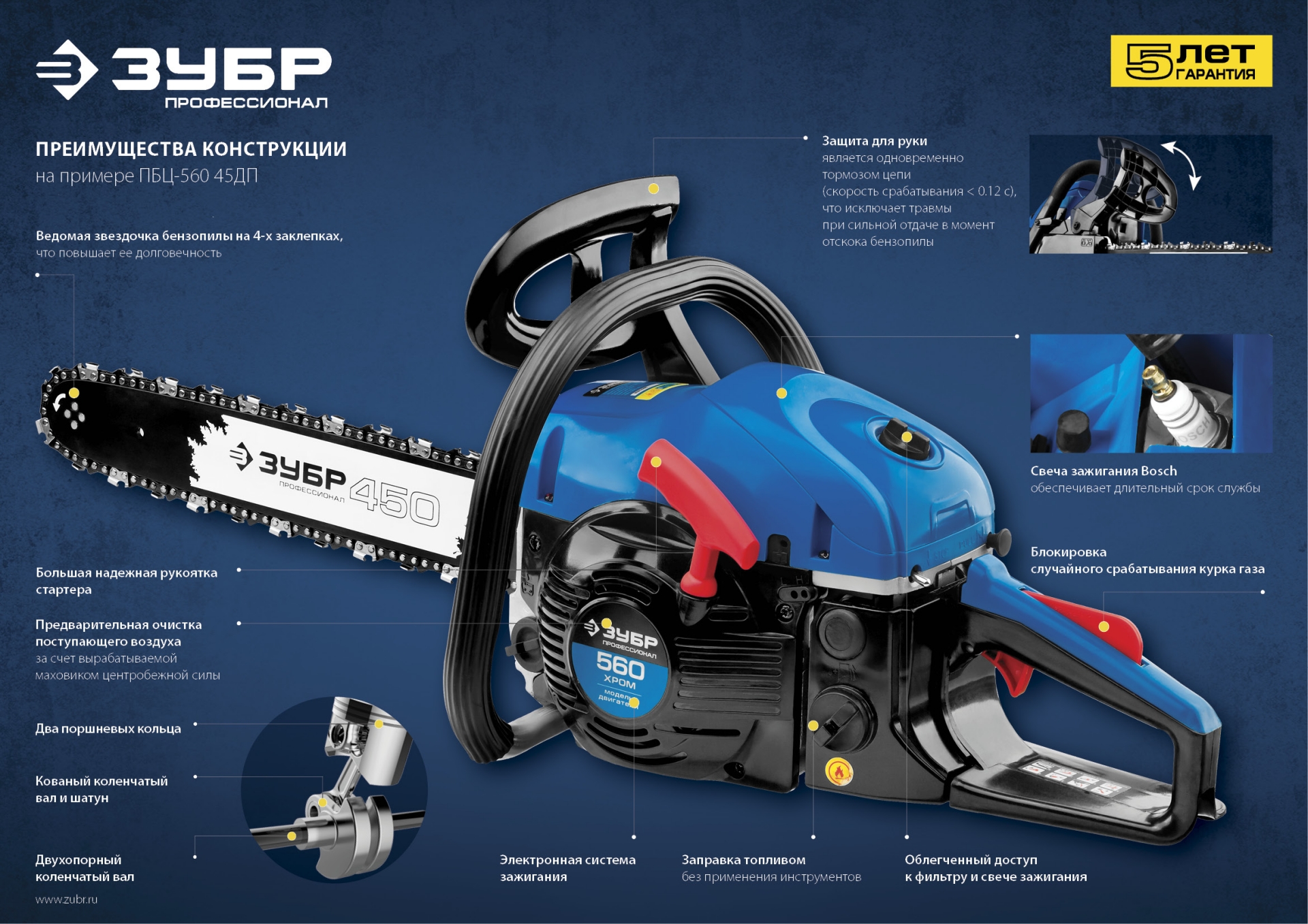 Идеальный вариант для пиления досок, бруса, стволов различных пород дерева на дачном участке. В отличие от электрической, бензиновая пила оснащена более мощным двигателем, безопасна в отношении поражения электрическим током, может работать в любую погоду и в любом месте. Функции легкого запуска, автоматической смазки цепи и эффективная антивибрационная защита делают пилу легкой в обращении и комфортной в работе. Двойной тормоз цепи, приводимый в действие при откидывании защитного щитка или при отпускании клавиши блокировки на рукоятке, а также встроенный цепеуловитель и металлический упор делают пилу безопасной в применении. Большая удельная мощность, высокое качество применяемых материалов и изготовления, обеспечивающие увеличенный ресурс, делают бензиновую пилу ЗУБР Вашим лучшим помощником