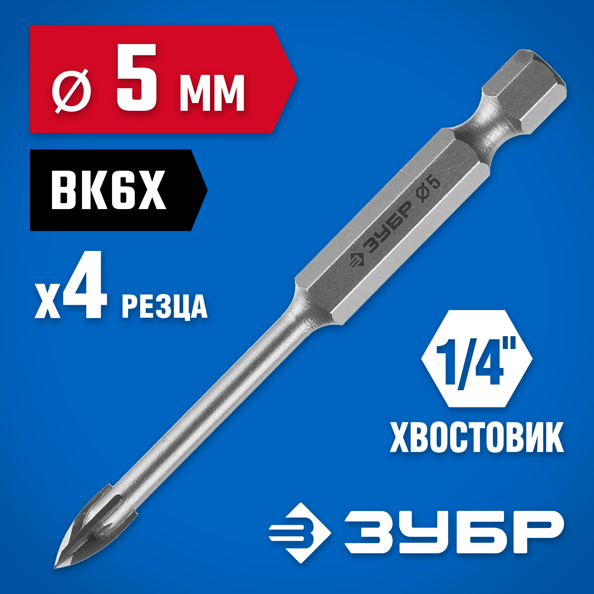 ЗУБР 5 мм, 4х кромка, HEX 1/4, Сверло по стеклу и кафелю, Профессионал (29845-05)