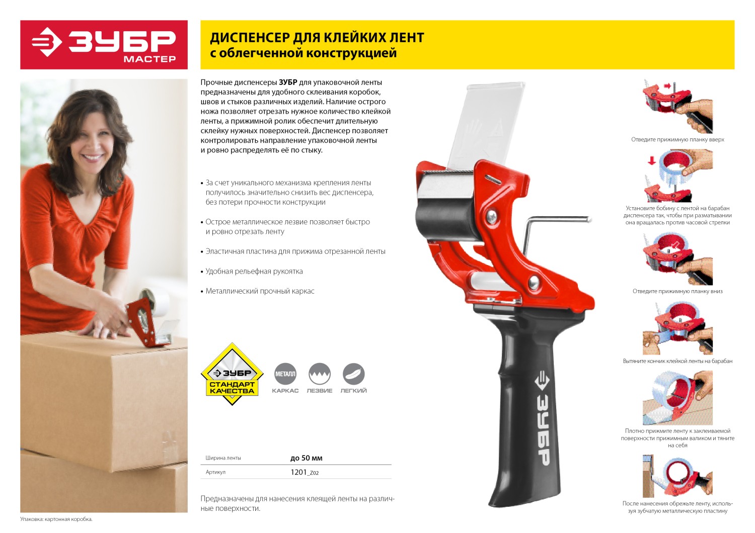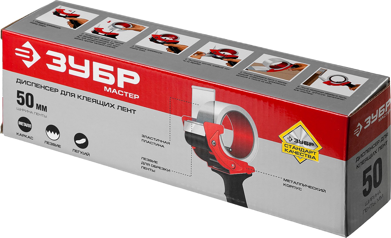 Обеспечивает удобство и комфорт при работе с клеящими лентами, облегчает и ускоряет работу. Снабжен металлическим лезвием для обрезки ленты, имеет удобную рукоятку и пластину для прижима отрезанной ленты. Оснащен металлическим каркасом, обеспечивающим высокую прочность изделия и длительный срок службы. Механический тормоз позволяет регулировать натяжение ленты.