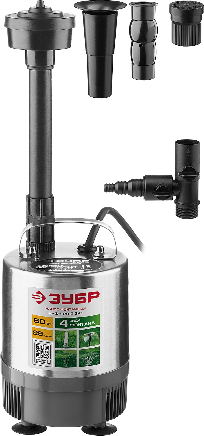 Простое средство для украшения сада. Обычный пруд с установкой насоса превращается в фонтан, причем, благодаря сменным насадкам, форма струи легко меняется между ″гейзером″, ″каскадом″ и ″колокольчиком″, а также может переключаться на водопад. Таким образом, одно изделие способно изменить Ваш пруд или сад, привнеся в него веселое и успокаивающее журчание воды, под которое так приятно отдыхать после рабочей недели