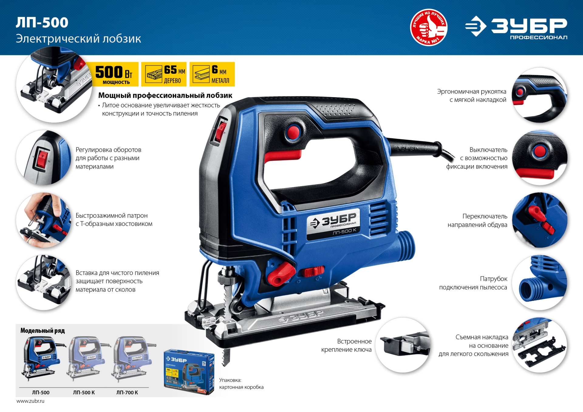 Профессиональный инструмент для всех видов пиления (прямого, наклонного, криволинейного) различных материалов (дерева, фанеры, пластика, металла) от тонких листов до досок толщиной 65 мм. Компактный и мощный, с удобным хватом и отличной маневренностью. Полезные ″мелочи″ вроде вставки для чистого пиления, легко скользящей накладки на основание, встроенного крепления ключа и переключения направлений обдува помогают работать комфортно и эффективно