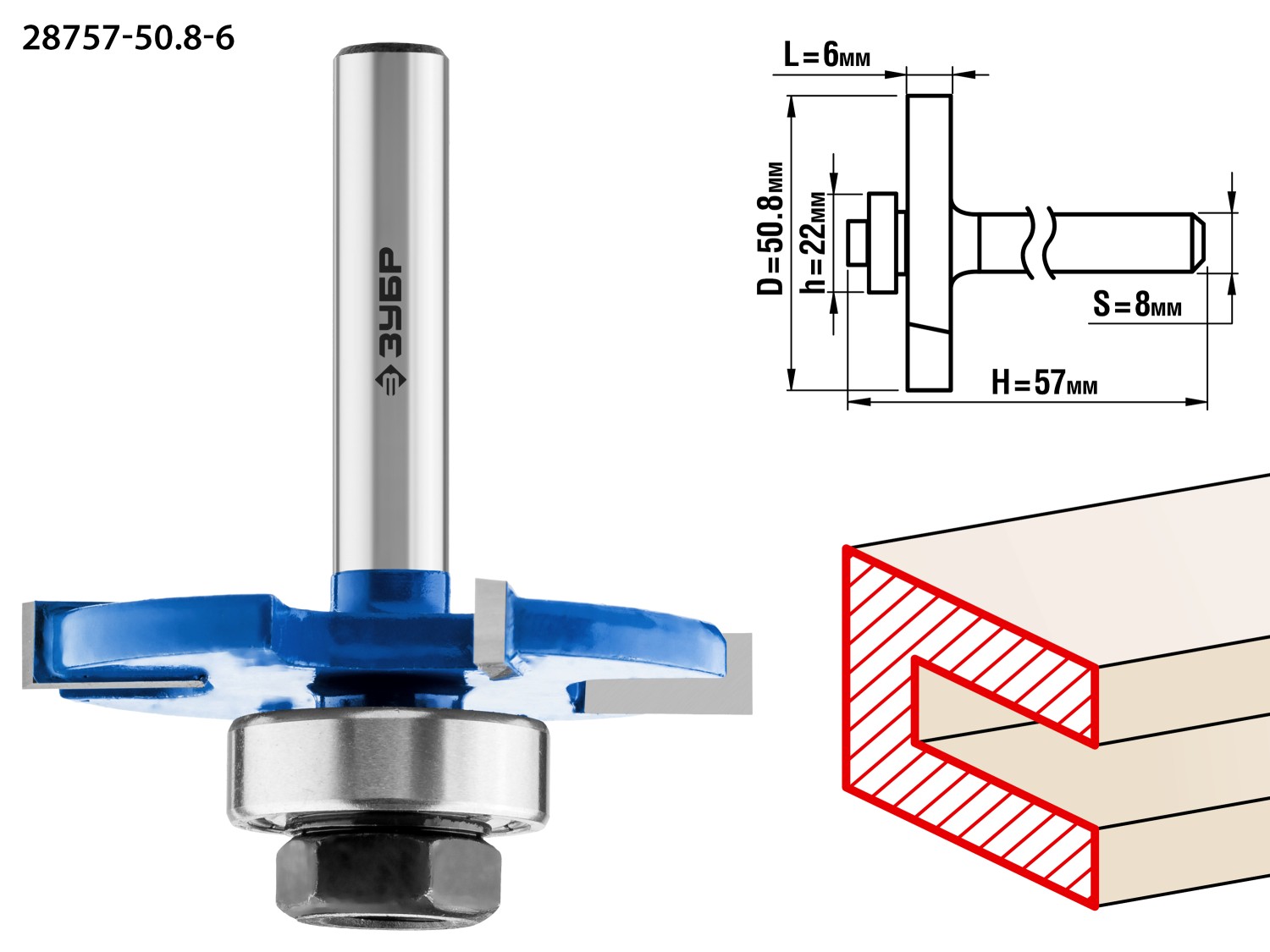 ЗУБР 50.8 x 6 мм, хвостовик 8 мм, фреза горизонтально-пазовая, Профессионал (28757-50.8-6)