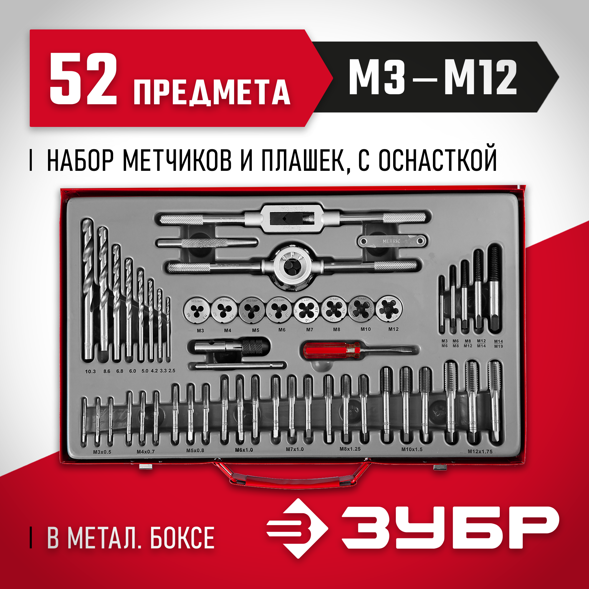 Набор предназначен для резьбонарезных работ в конструкциях и заготовках из сталей и цветных металлов. Метчики ручные однопроходные используются для нарезания внутренней метрической резьбы с нормальным и мелким шагом в глухих и сквозных отверстиях. Метчик трубный предназначен для нарезания внутренней трубной резьбы. Плашки предназначены для нарезания внешней метрической резьбы с нормальным и мелким шагом. Плашка трубная используется для нарезания трубной резьбы Метчикодержатель предназначен для надежного закрепления метчиков Плашкодержатель используется для закрепления плашек при проведении резьбонарезных работ Резьбомер предназначен для подбора необходимого шага метрической резьбы. Кернер используется для предварительного накернивания перед засверливанием. Экстрактор конический с обратной резьбой предназначен для извлечения обломанных болтов и шпилек