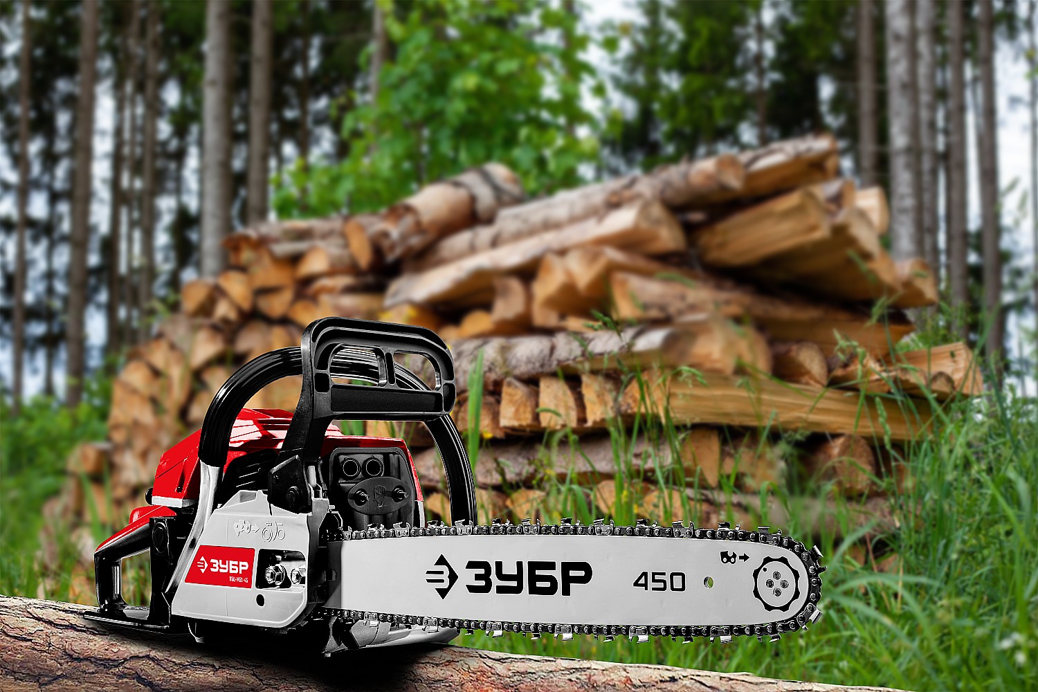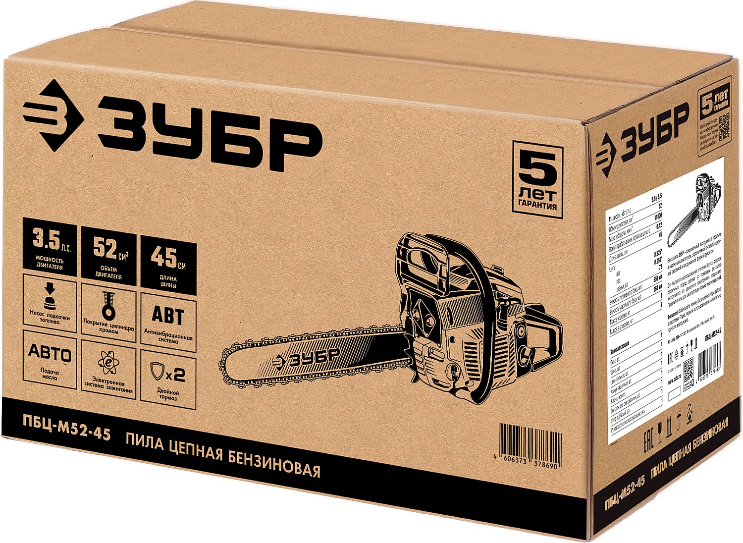 Идеальный вариант для пиления досок, бруса, стволов различных пород дерева на дачном участке. В отличие от электрической, бензиновая пила оснащена более мощным двигателем, безопасна в отношении поражения электрическим током, может работать в любую погоду и в любом месте. Функции легкого запуска, автоматической смазки цепи и эффективная антивибрационная защита делают пилу легкой в обращении и комфортной в работе. Двойной тормоз цепи, приводимый в действие при откидывании защитного щитка или при отпускании клавиши блокировки на рукоятке, а также встроенный цепеуловитель и металлический упор делают пилу безопасной в применении. Большая удельная мощность, высокое качество применяемых материалов и изготовления, обеспечивающие увеличенный ресурс, делают бензиновую пилу ЗУБР Вашим лучшим помощником. Обратите внимание, что рекомендуемая пильная гарнитура ЗУБР устанавливается только комплектом