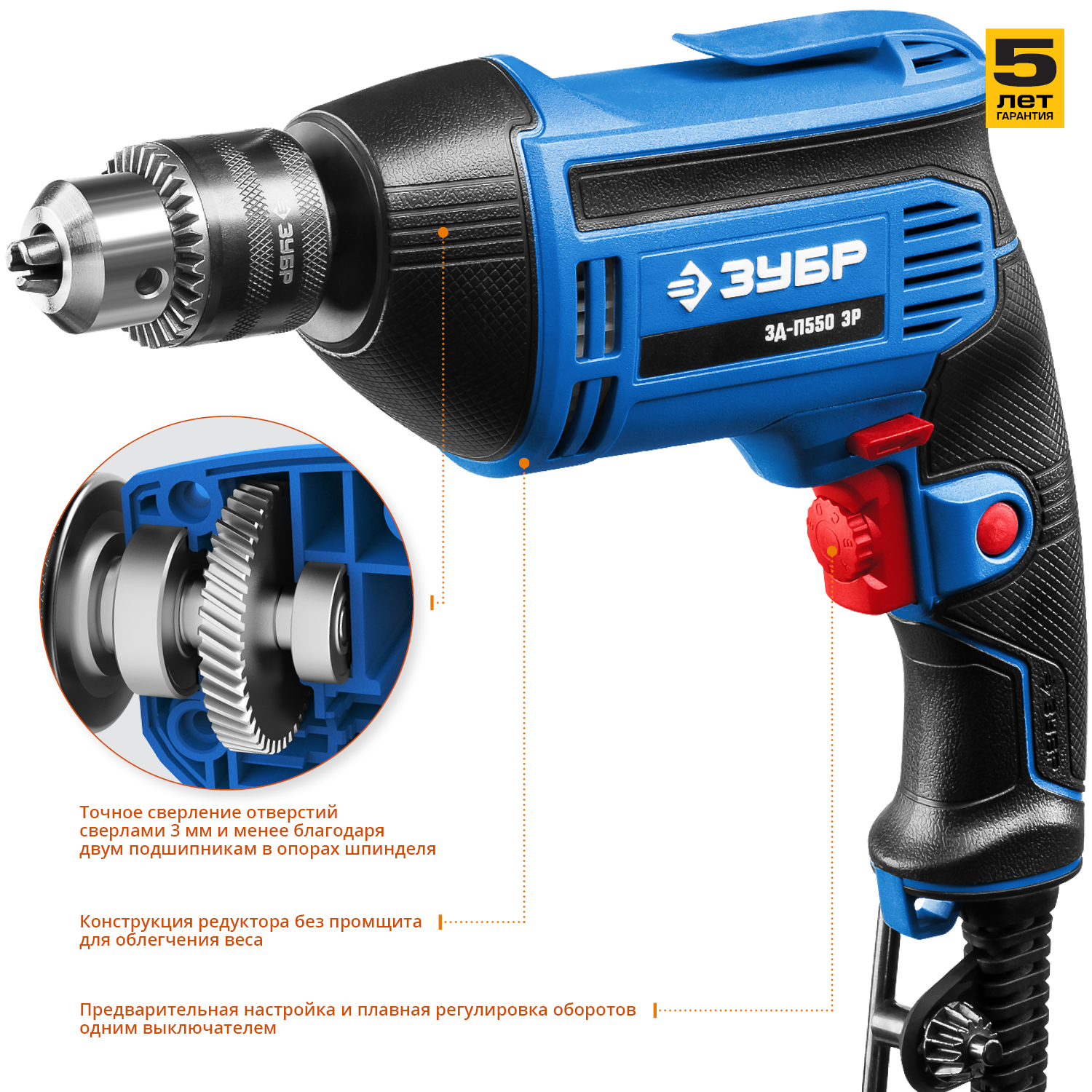 - Электронная регулировка оборотов от малых (для аккуратного засверливания) до высоких (для быстрого сверления)