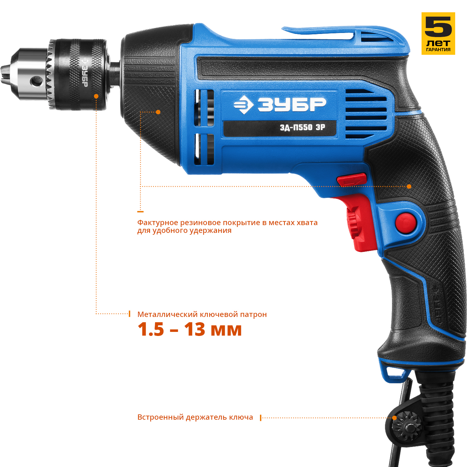 - Цельнометаллический ключевой патрон диаметром 13мм для установки, в том числе, крупного расходного инструмента