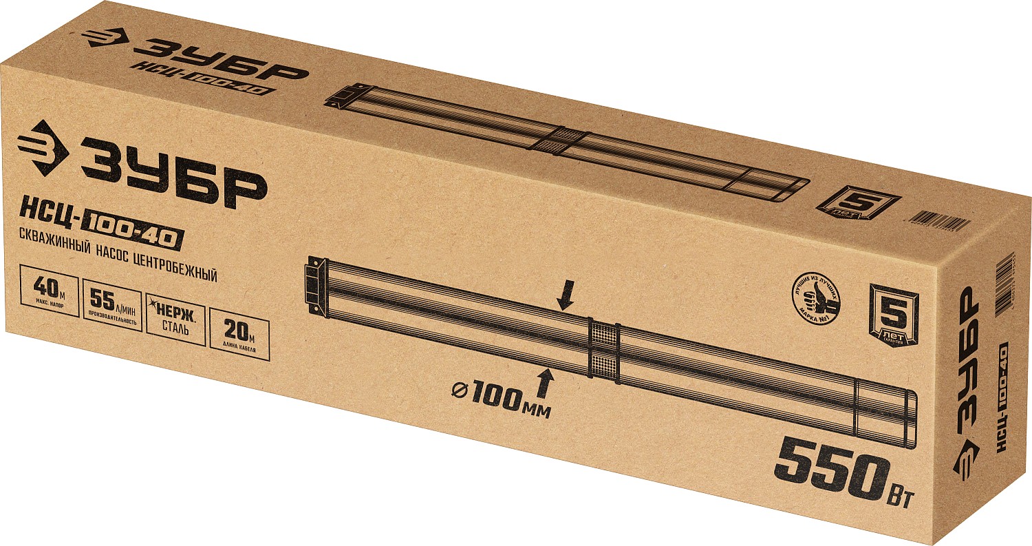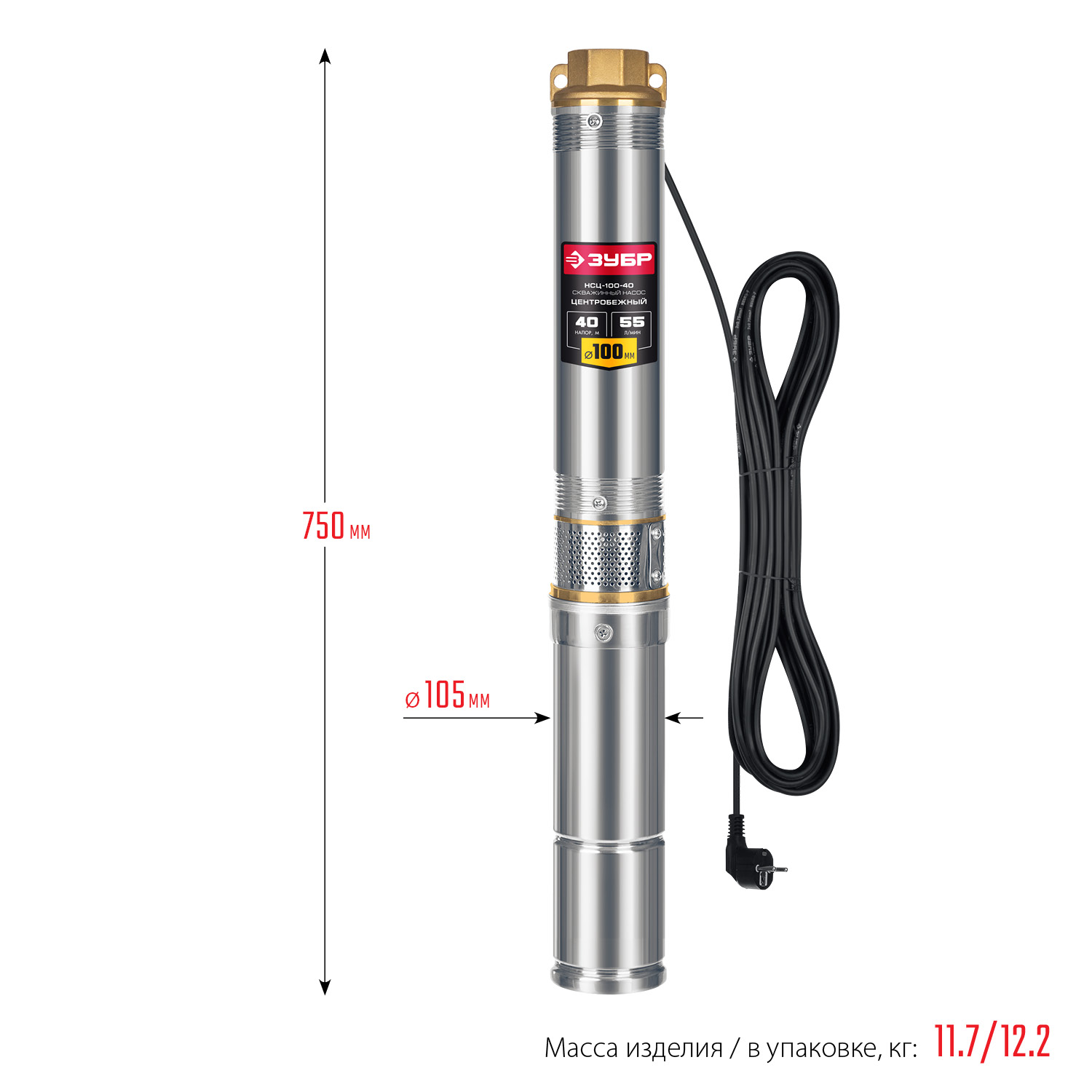 ЗУБР 550 Вт, 40 м напор, скважинный центробежный насос, корпус из нержавеющей стали (НСЦ-100-40)