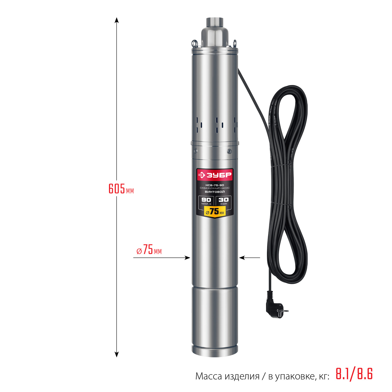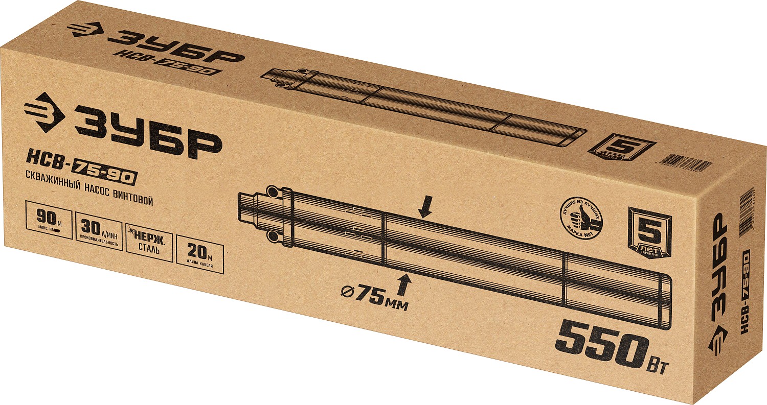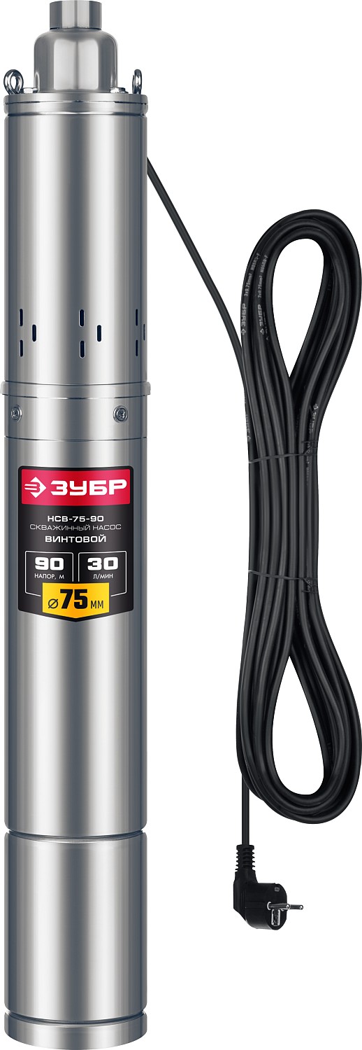 ЗУБР 550 Вт, 90 м напор, скважинный насос винтовой, корпус из нержавеющей стали (НСВ-75-90)