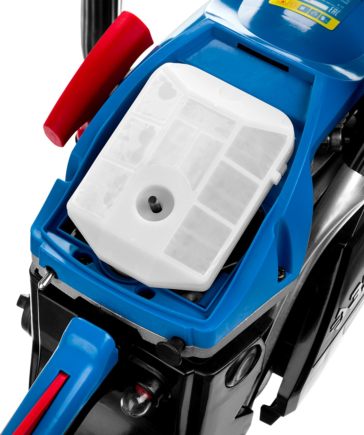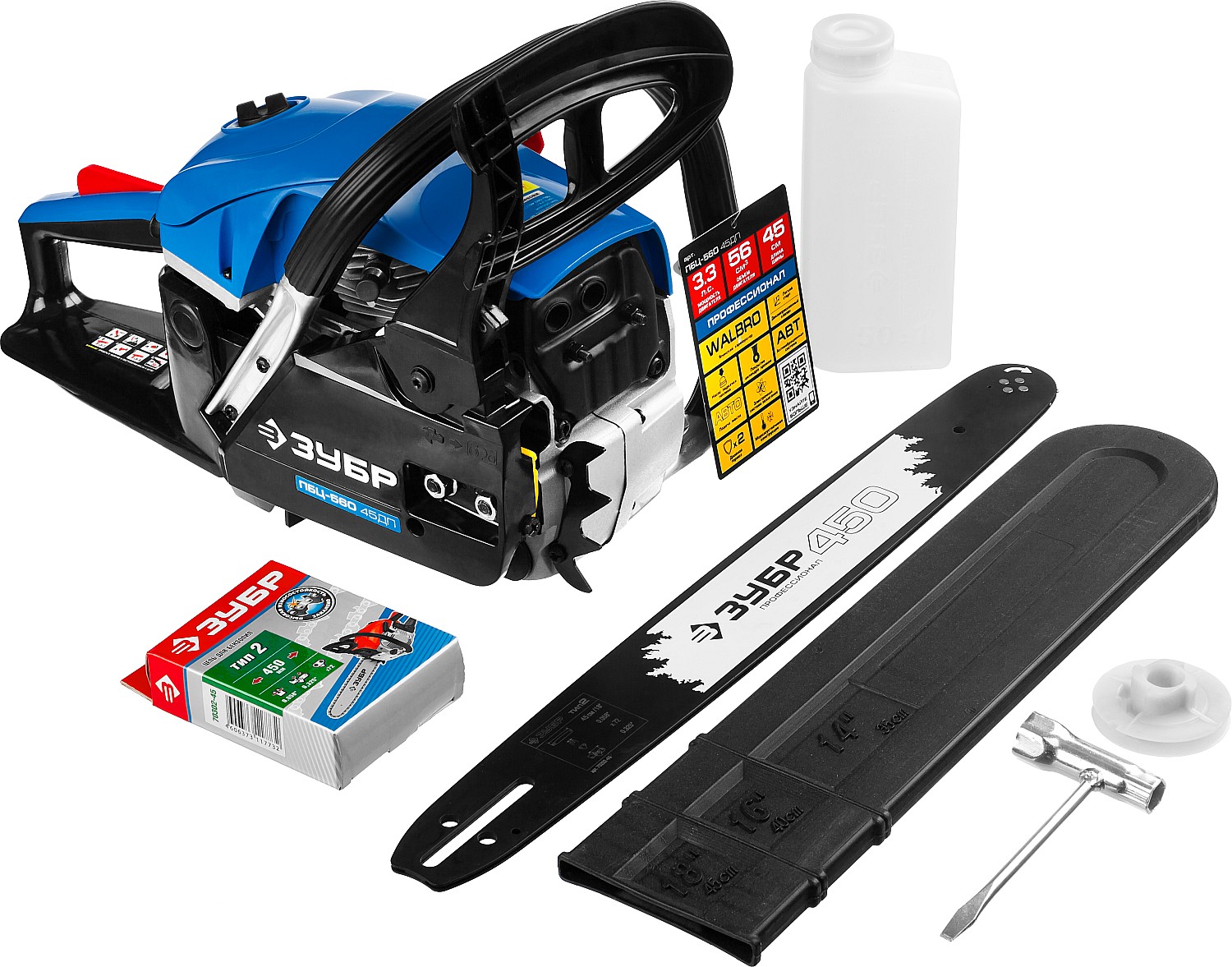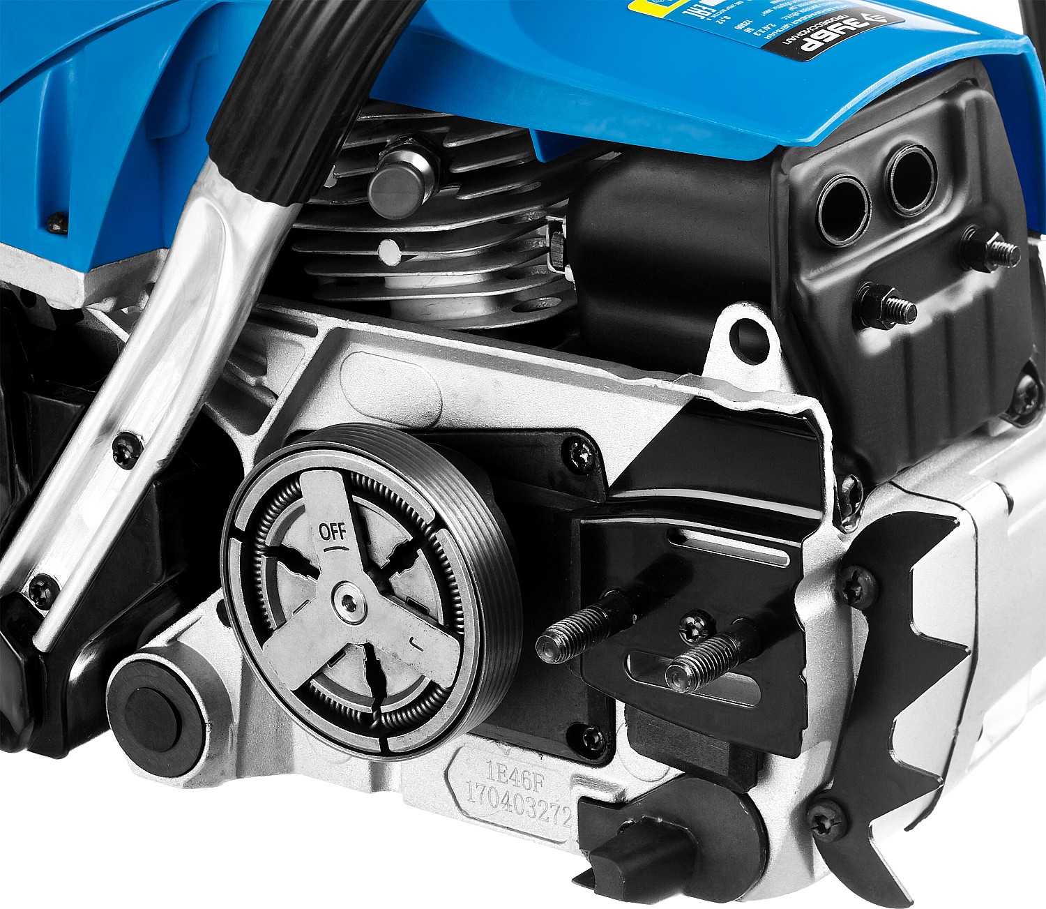 Идеальный вариант для пиления досок, бруса, стволов различных пород дерева на дачном участке. В отличие от электрической, бензиновая пила оснащена более мощным двигателем, безопасна в отношении поражения электрическим током, может работать в любую погоду и в любом месте. Функции легкого запуска, автоматической смазки цепи и эффективная антивибрационная защита делают пилу легкой в обращении и комфортной в работе. Двойной тормоз цепи, приводимый в действие при откидывании защитного щитка или при отпускании клавиши блокировки на рукоятке, а также встроенный цепеуловитель и металлический упор делают пилу безопасной в применении. Большая удельная мощность, высокое качество применяемых материалов и изготовления, обеспечивающие увеличенный ресурс, делают бензиновую пилу ЗУБР Вашим лучшим помощником