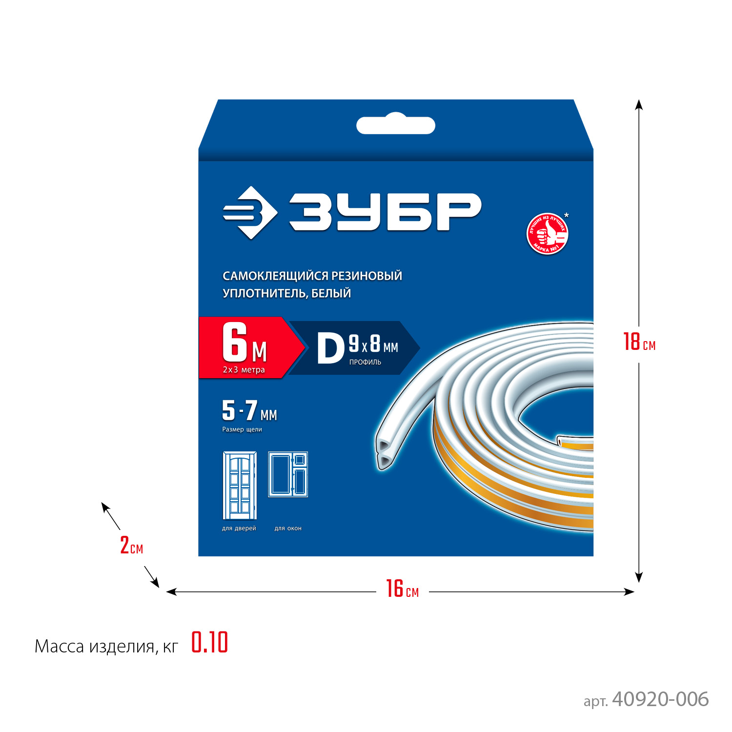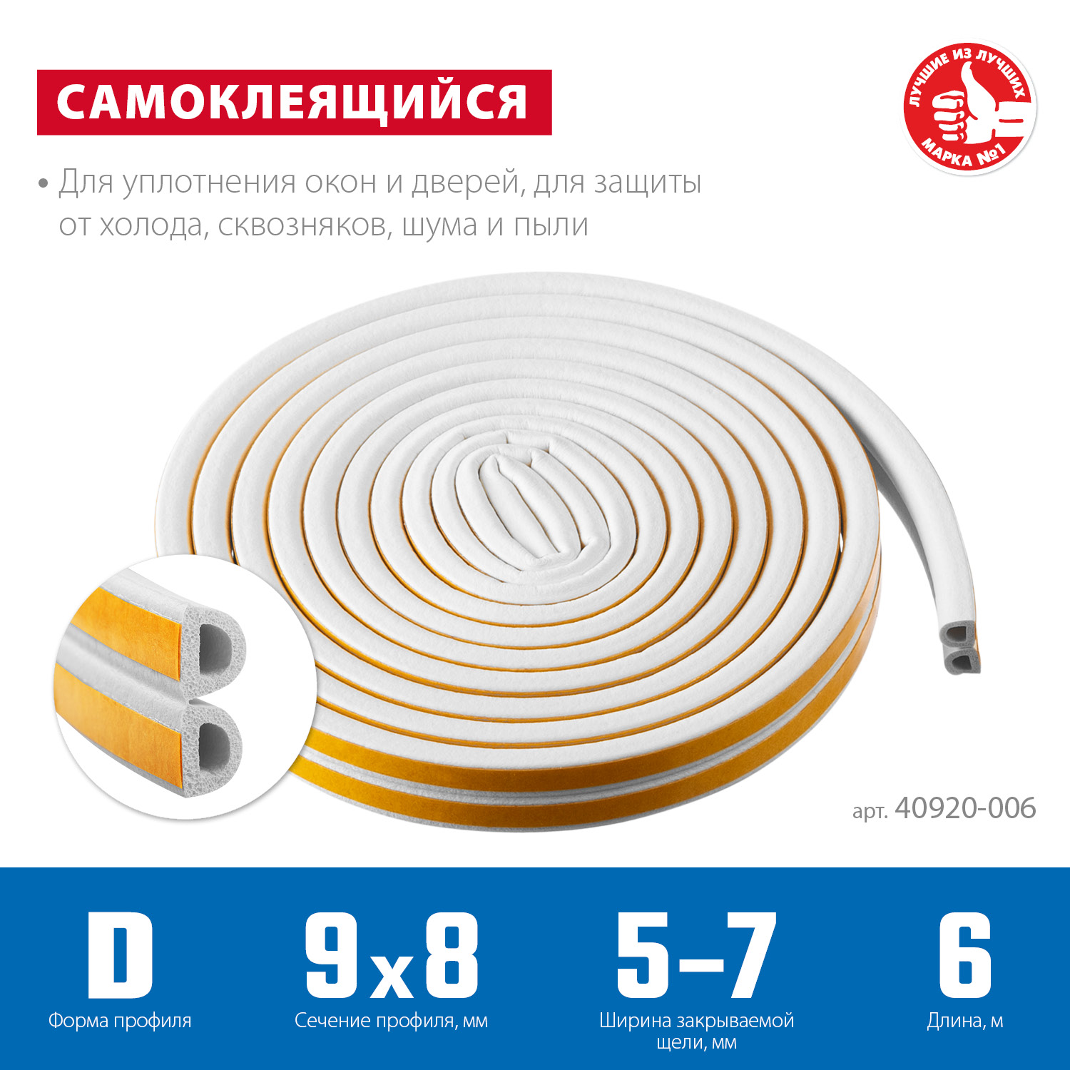ЗУБР 6 м, D-профиль, размер 9 х 8 мм, белый, самоклеящийся резиновый уплотнитель, Профессионал (40920-006)