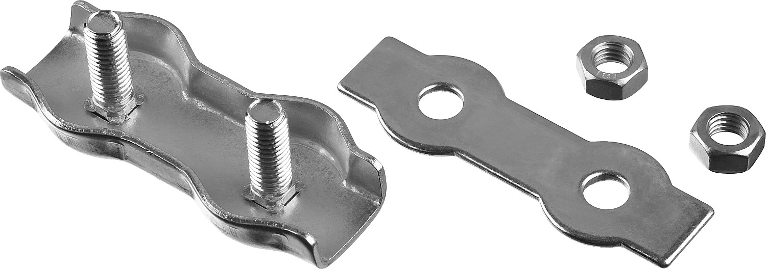 Для формирования петель на концах троса. Используются на тросах без оплетки ПВХ (если трос имеет оплетку, ее необходимо снять перед установкой зажима). Свободный конец троса закладывается в зажим (конец троса должен выходить из зажима на расстояние не менее 1/2 диаметра троса). Далее в петлю троса закладывается коуш, после которого трос помещается в зажим с другой стороны винта. Сверху помещается прижимная пластина, которую небходимо крепко зафиксировать с помощью гаек. Свободный конец троса рекомендуется обмотать изолентой для предотвращения разматывания троса после установки. Перед использованием необходимо убедиться, что гайки на зажимах закручены полностью.