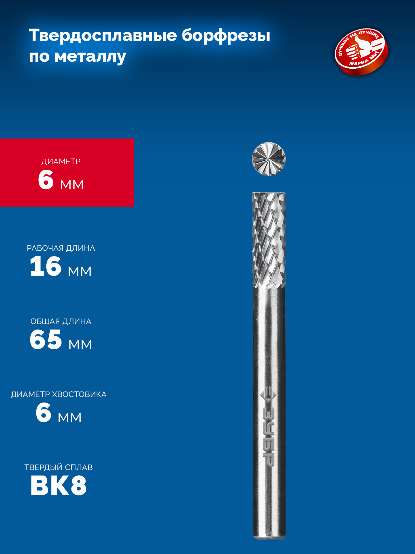 ЗУБР 6х16 мм, тип B (цилиндр с торцевыми зубьями), хв-к 6 мм, твердосплавная борфреза, ПРОФЕССИОНАЛ (28801-6-16)