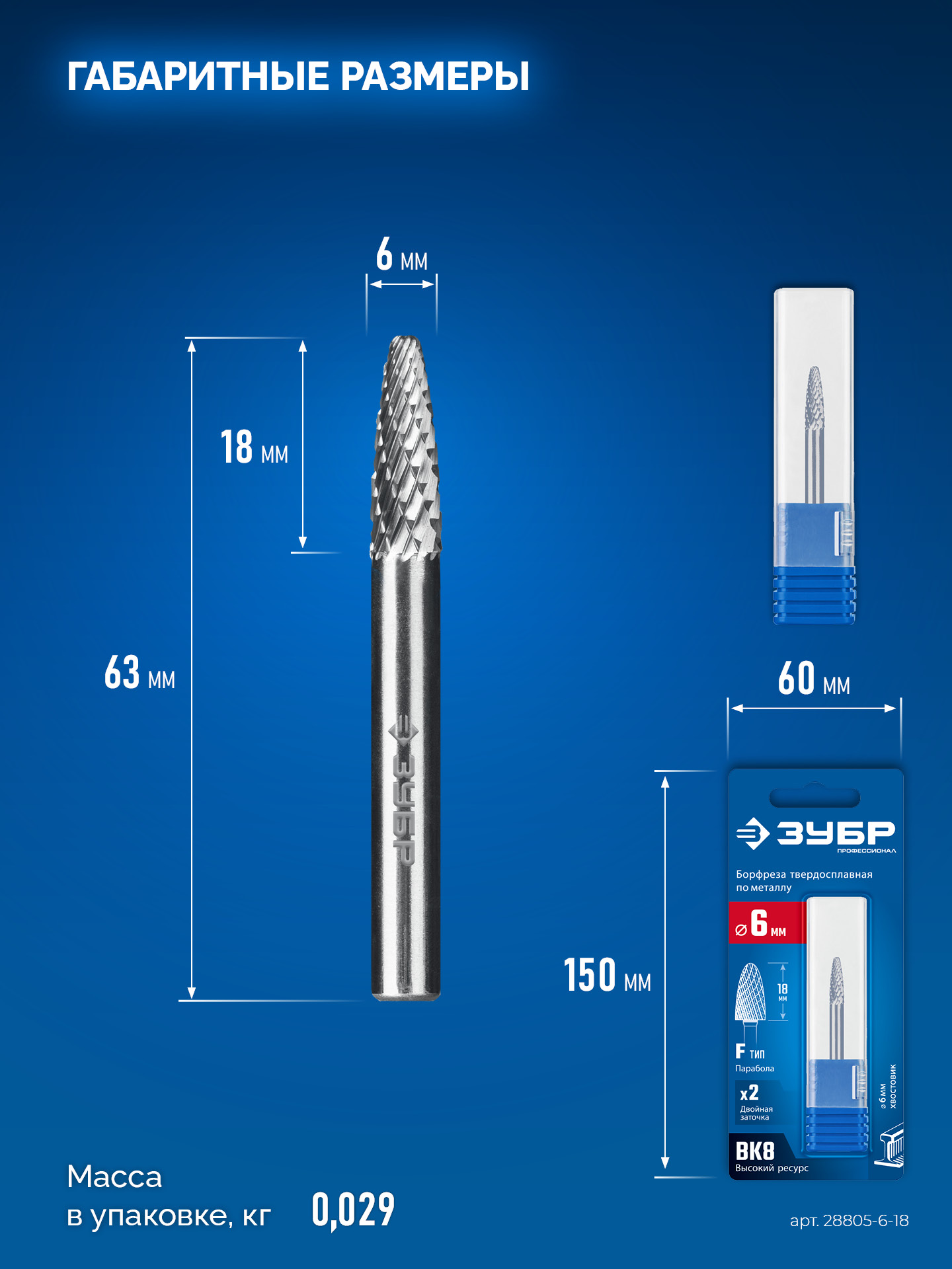 ЗУБР 6х18 мм, тип F (парабола с закругленным углом, радиус 1.5 мм), хв-к 6 мм, твердосплавная борфреза, ПРОФЕССИОНАЛ (28805-6-18)