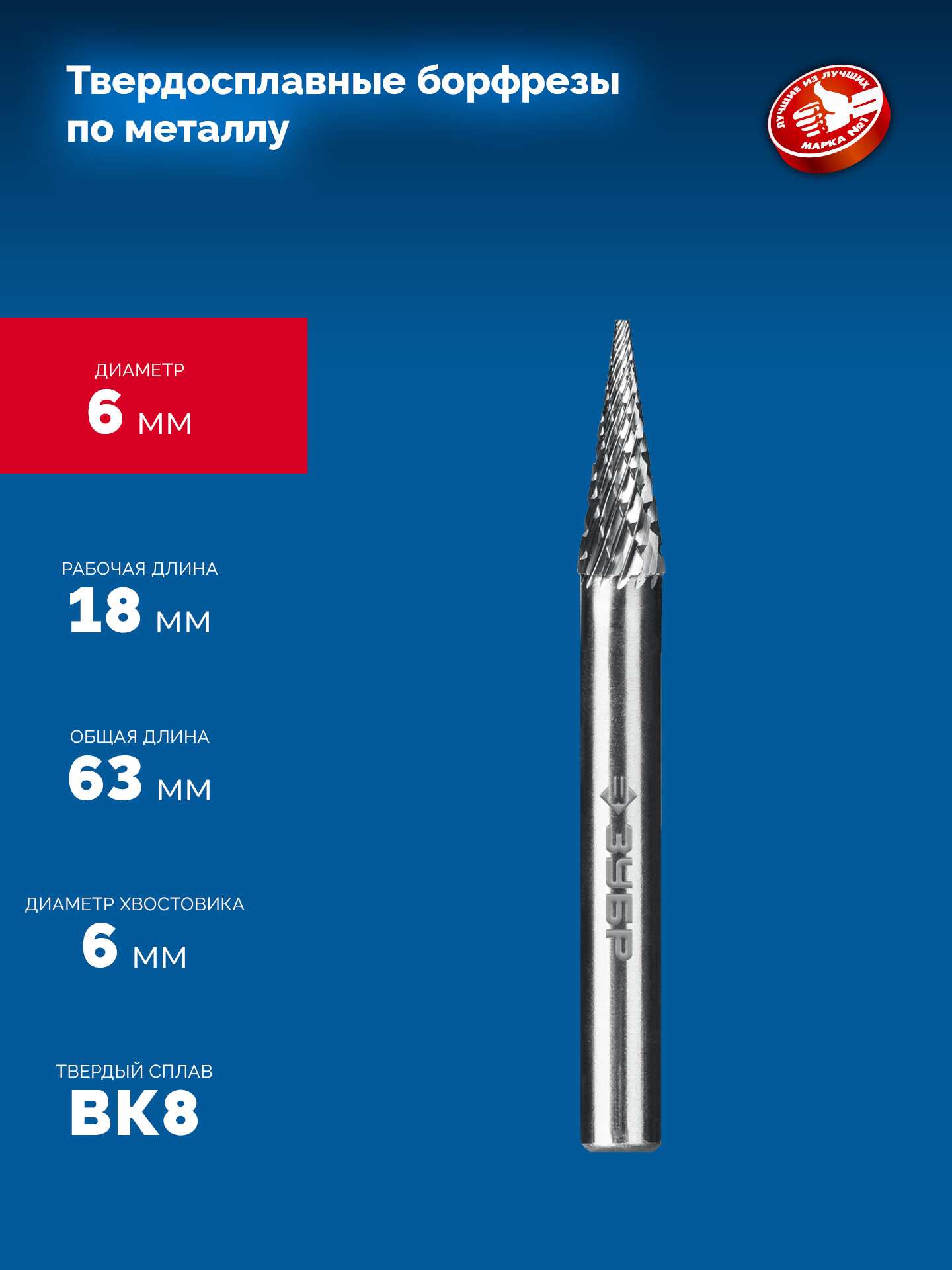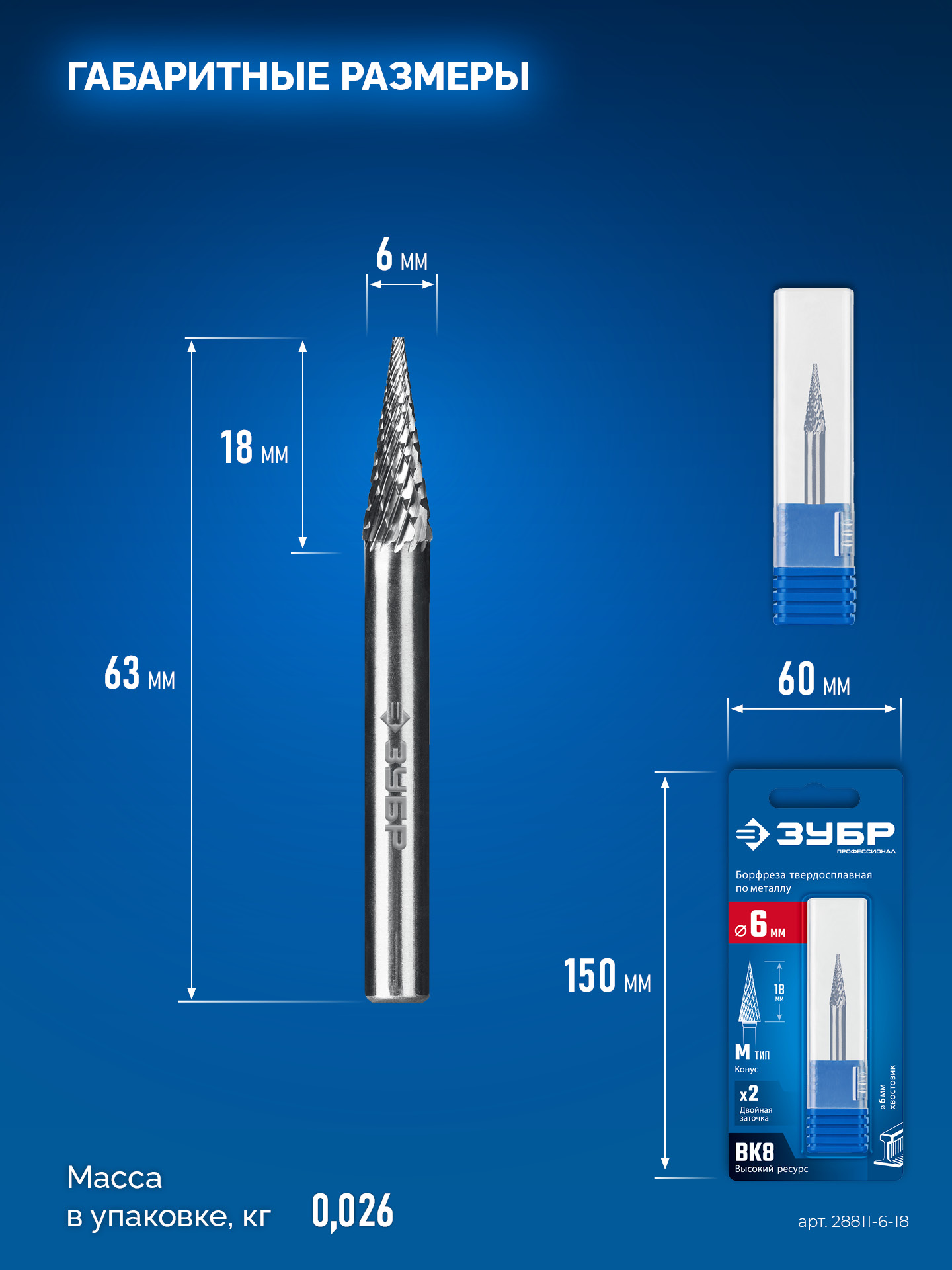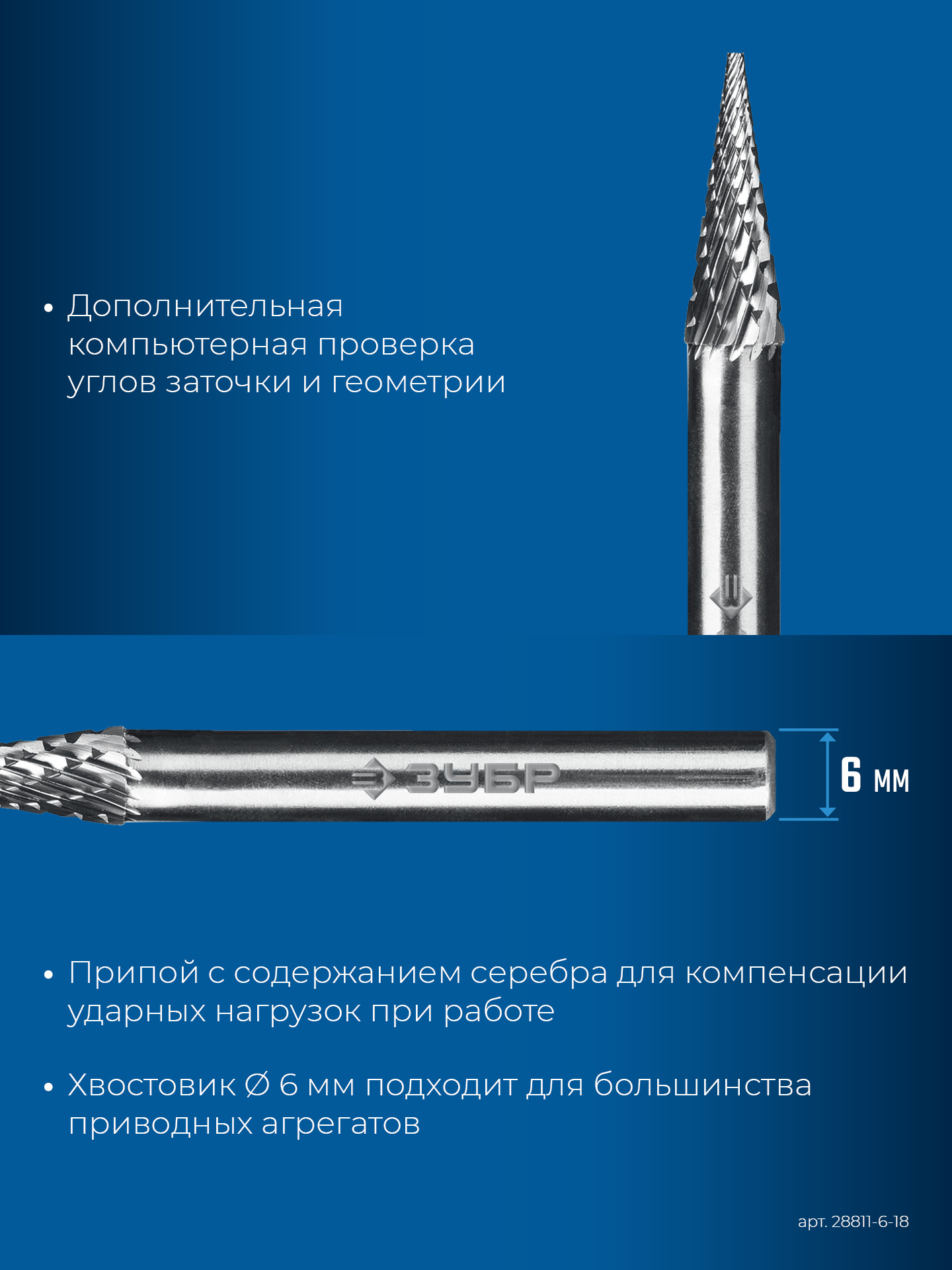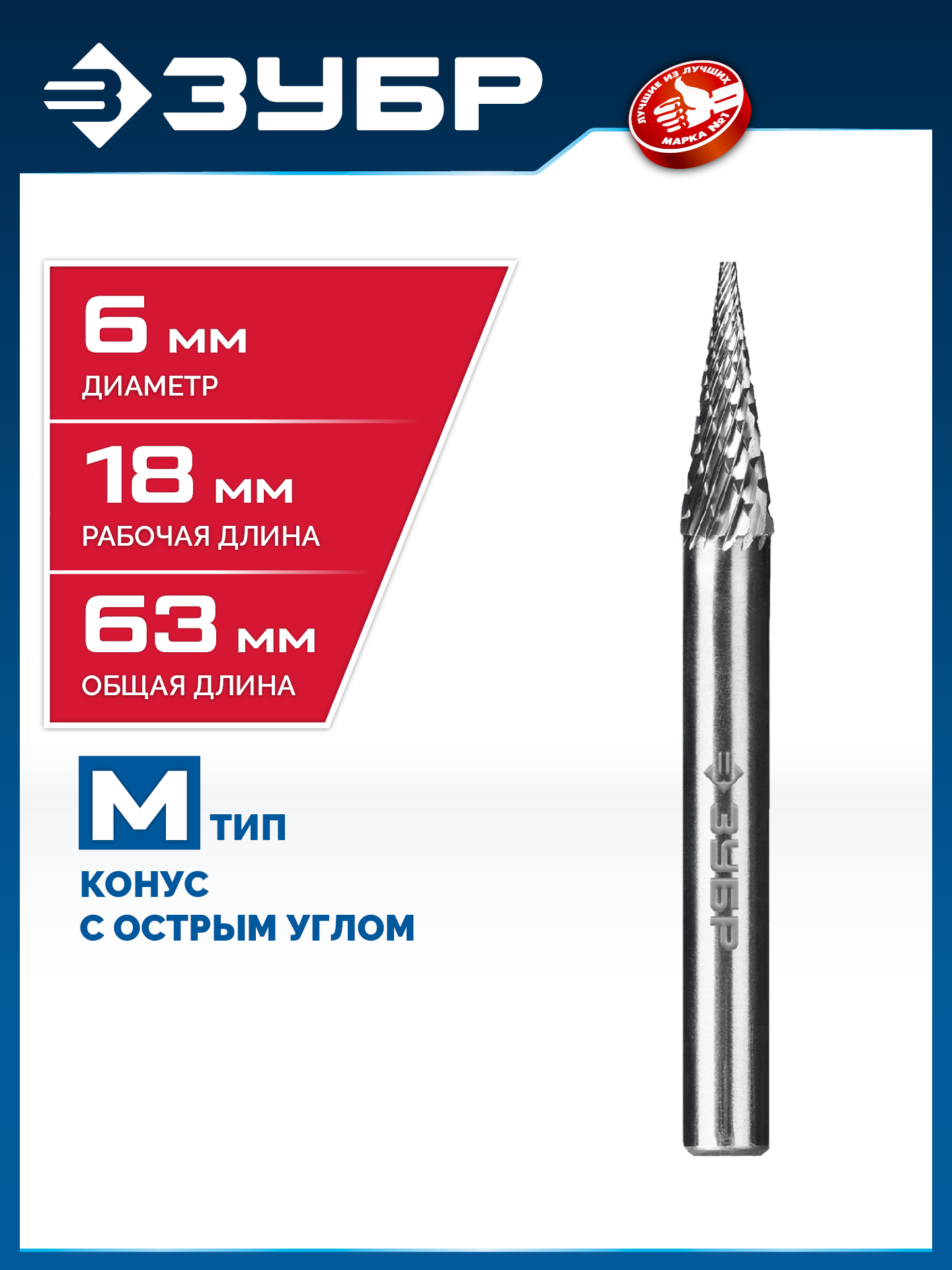 ЗУБР 6х18 мм, тип M (конус с острым углом 14°), хв-к 6 мм, твердосплавная борфреза, ПРОФЕССИОНАЛ (28811-6-18)