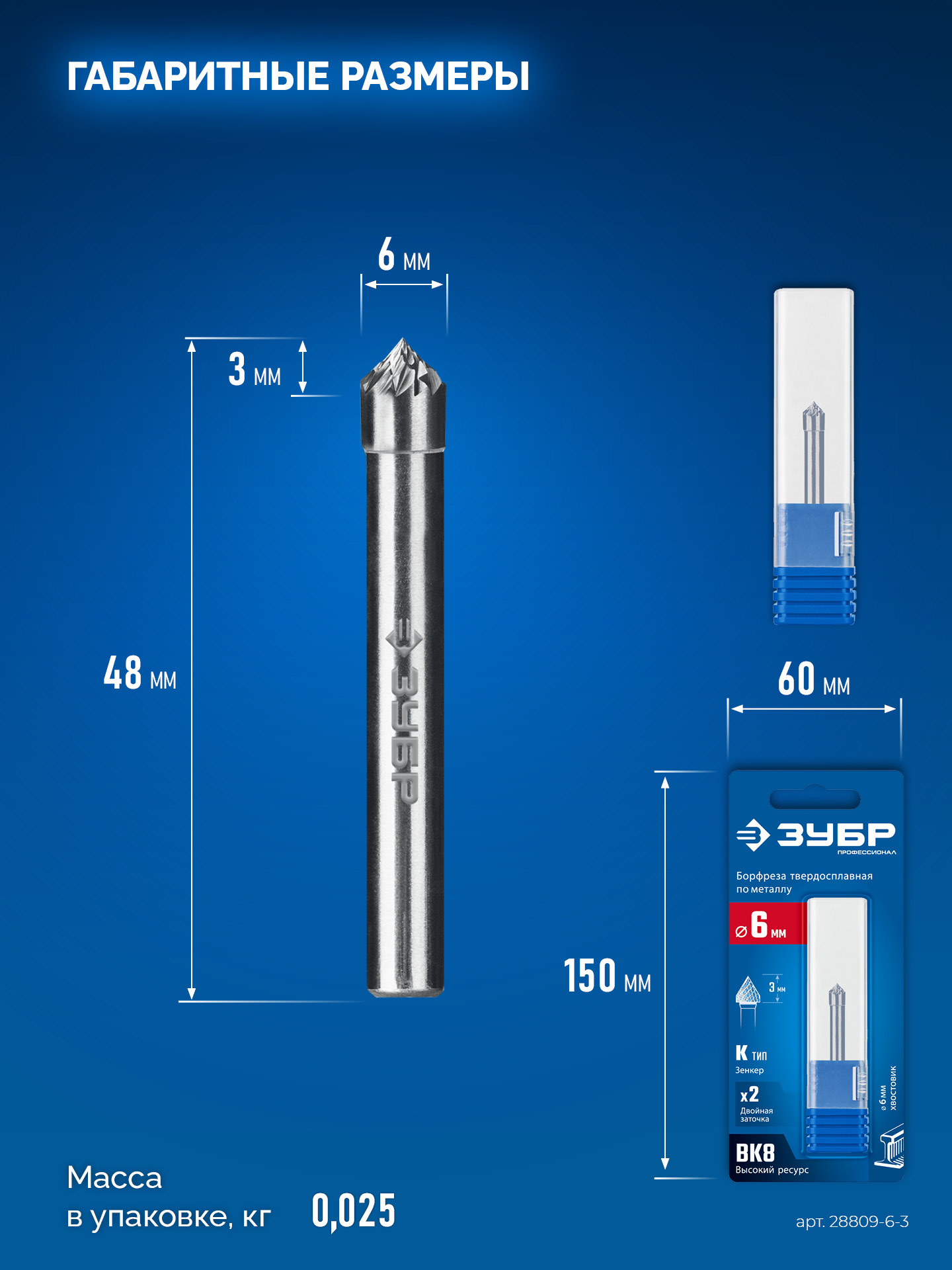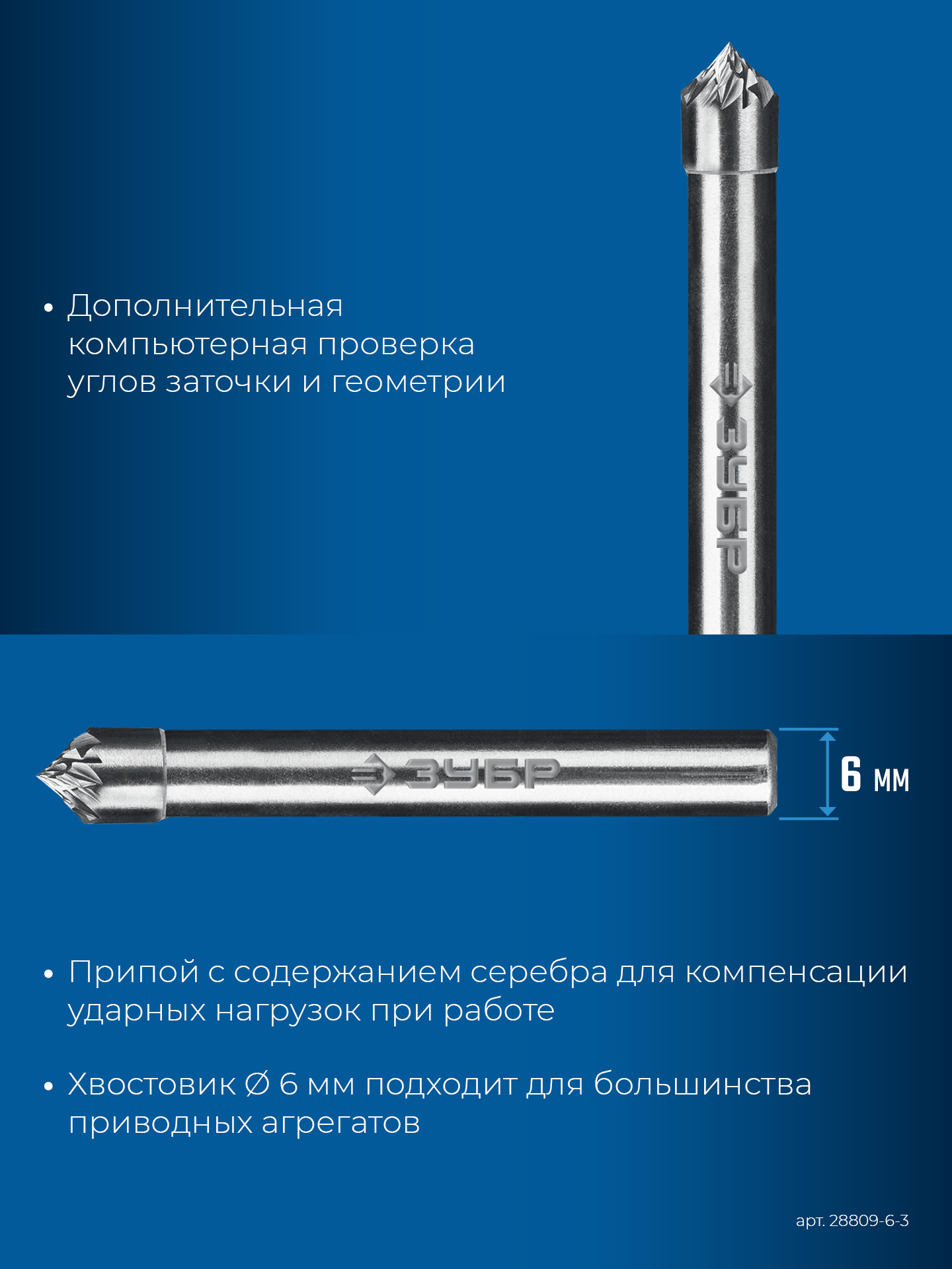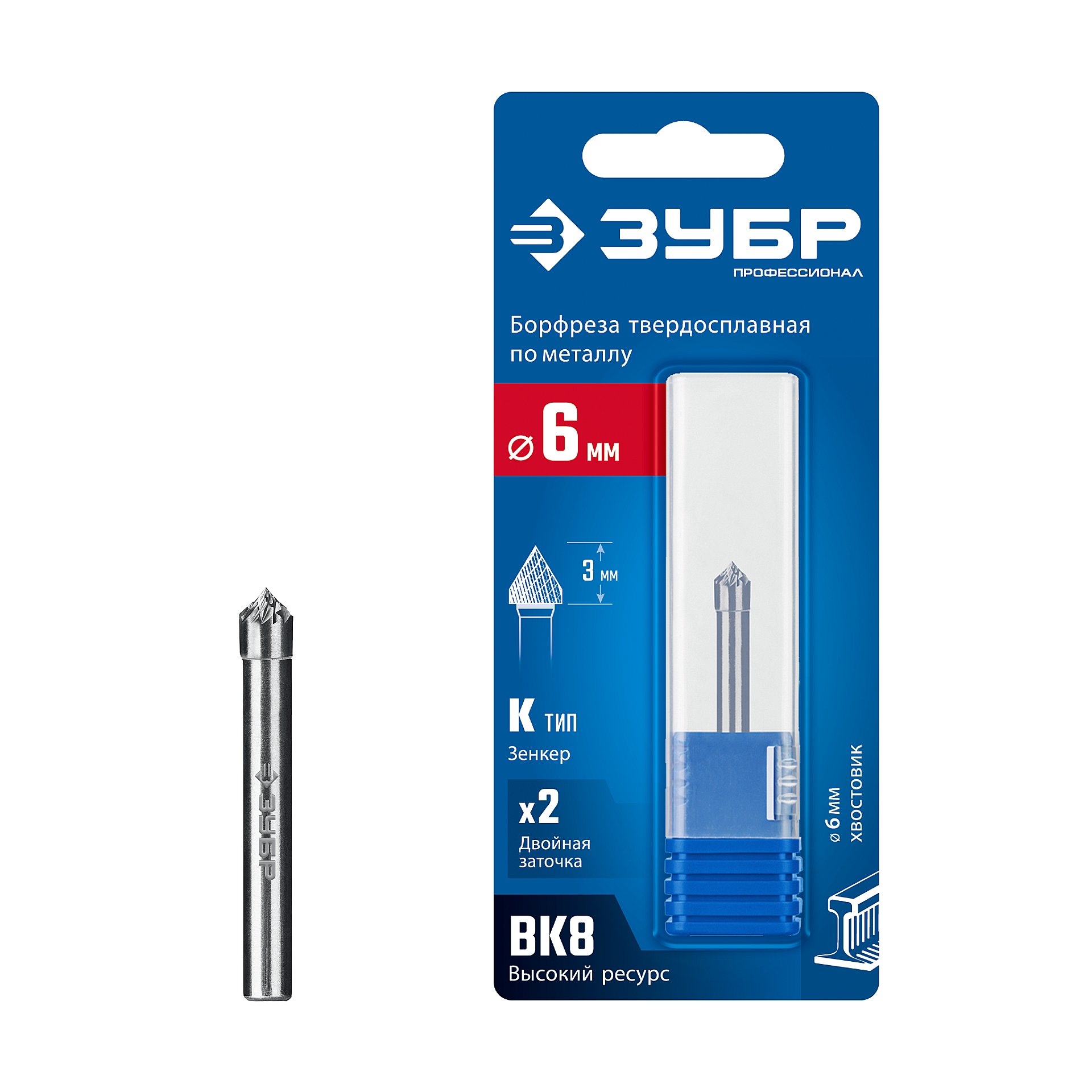 ЗУБР 6х3 мм, тип K (зенкер с вершиной 90°), хв-к 6 мм, твердосплавная борфреза, ПРОФЕССИОНАЛ (28809-6-3)