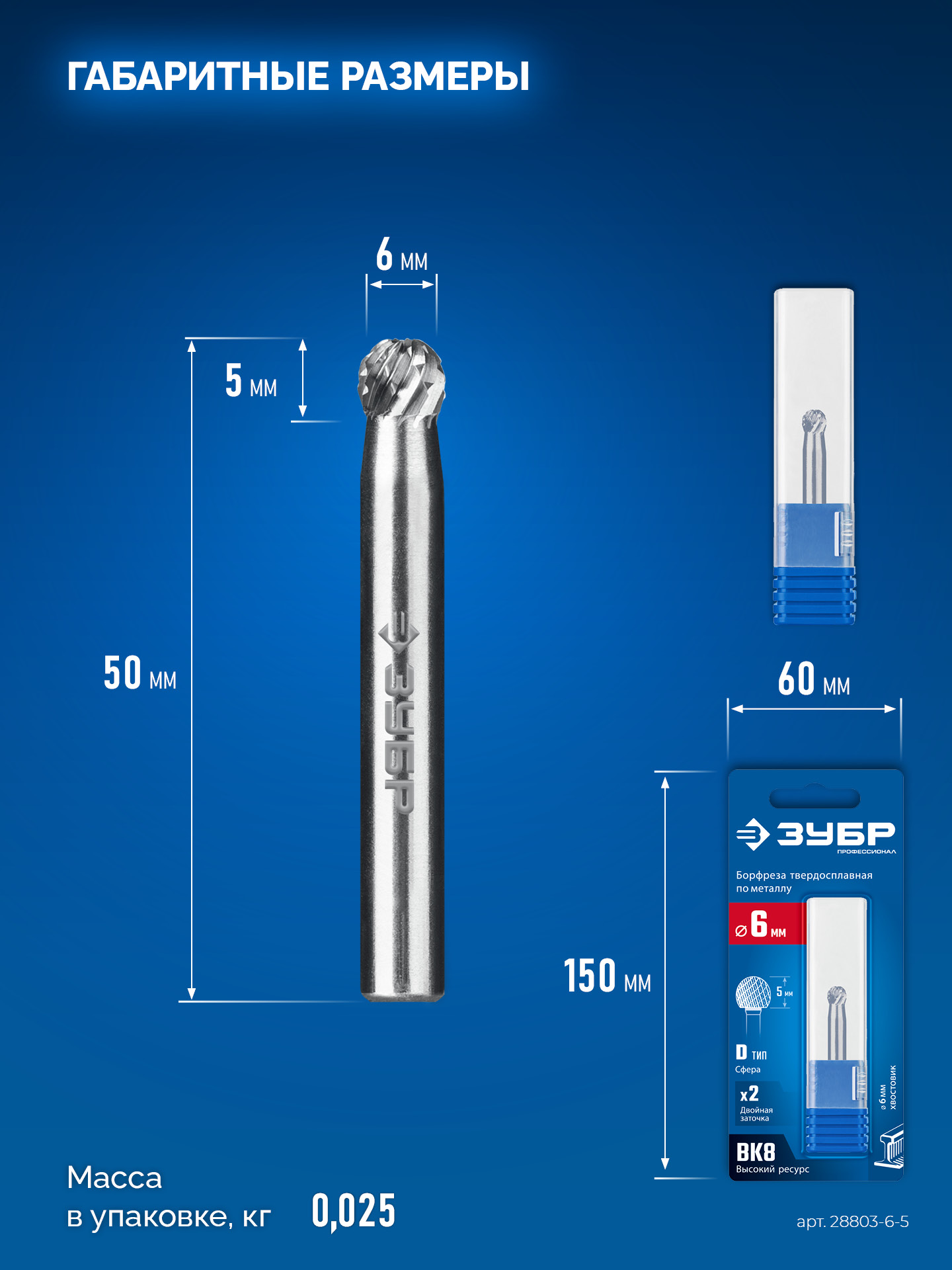 ЗУБР 6х5 мм, тип D (сфера), хв-к 6 мм, твердосплавная борфреза, ПРОФЕССИОНАЛ (28803-6-5)