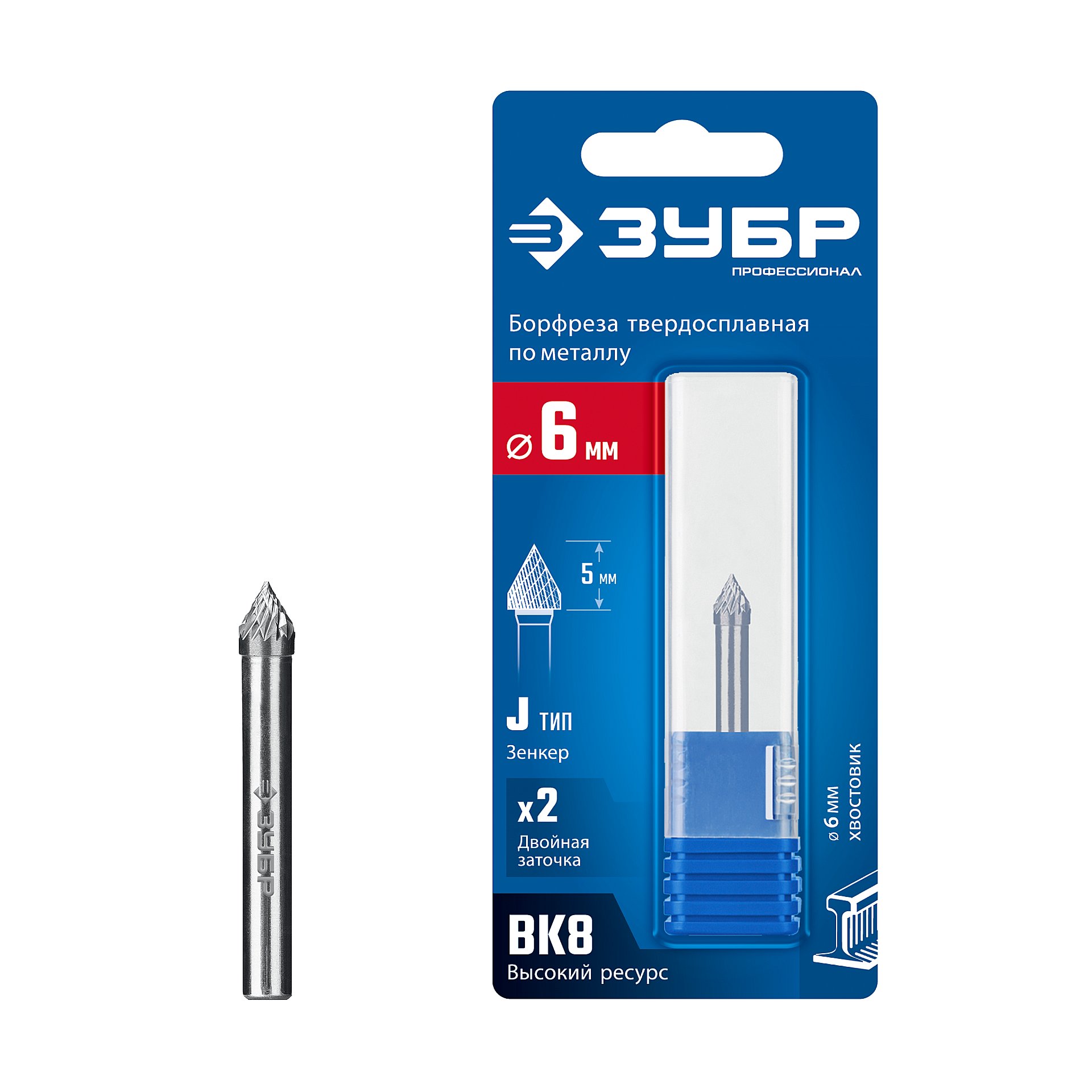ЗУБР 6х5 мм, тип J (зенкер с вершиной 60°), хв-к 6 мм, твердосплавная борфреза, ПРОФЕССИОНАЛ (28808-6-5)