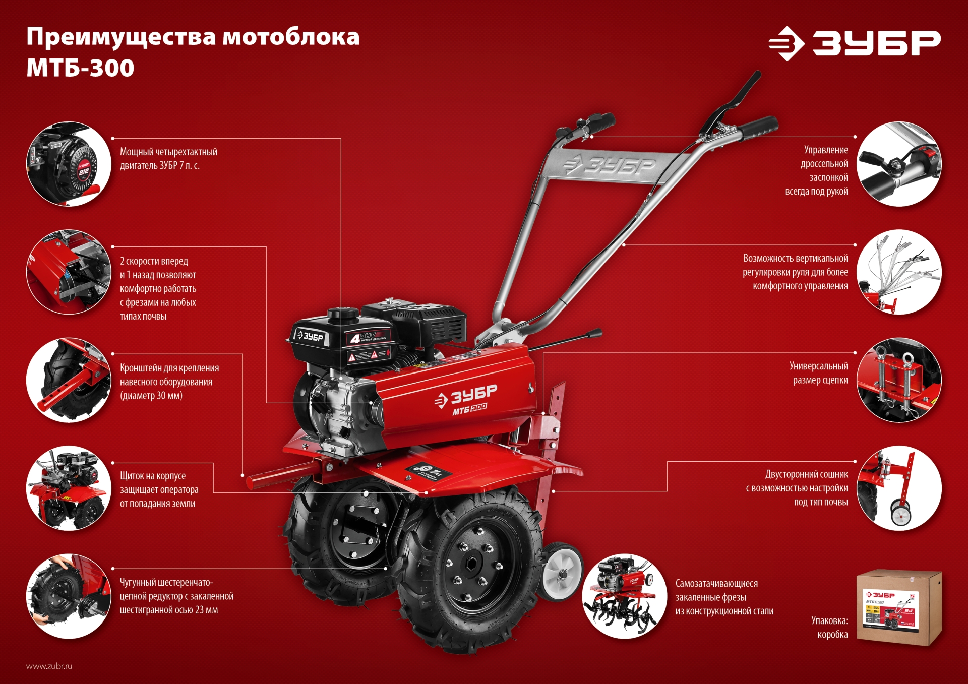 - 2 скорости вперед (основная и повышающая) и 1 назад позволяют комфортно работать на любых типах почвы