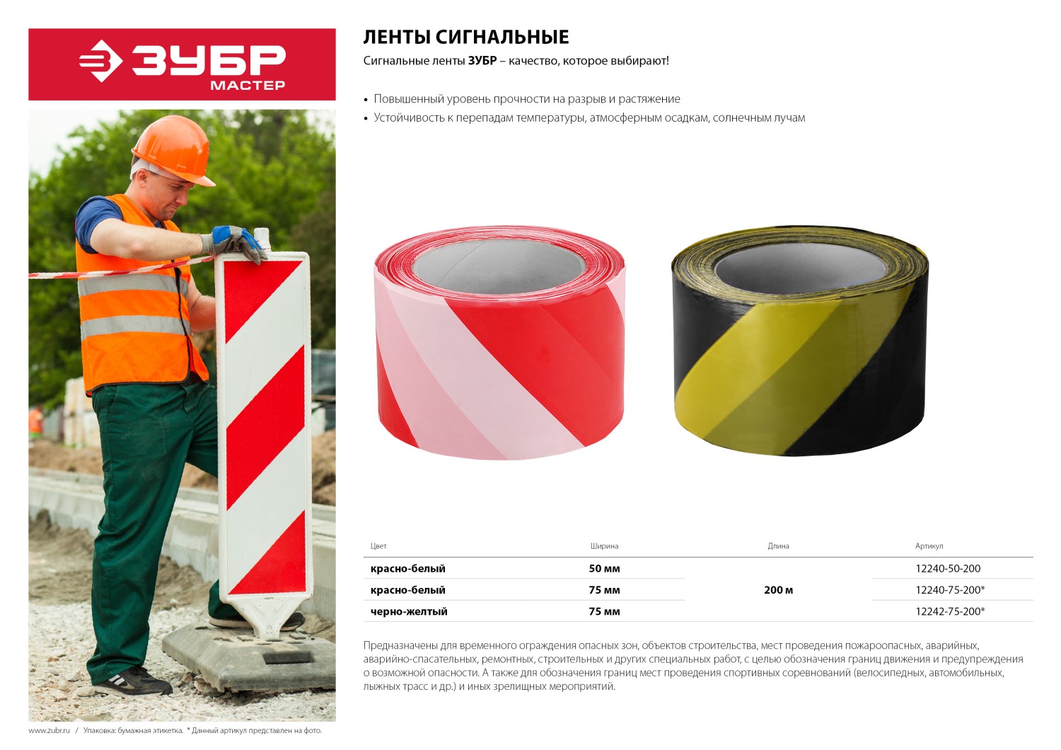 Предназначена для временного ограждения опасных зон, объектов строительства, мест проведения пожароопасных, аварийных, аварийно-спасательных, ременотных, строительных и других специальных работ с целью обозначения границ движения и предупреждения о возможной опасности. Также применяется для обозначения границ мест проведения спортивных соревнований (велосипедных, автомобильных, лыжных трасс и т.д.) и иных зрелищных мероприятий.