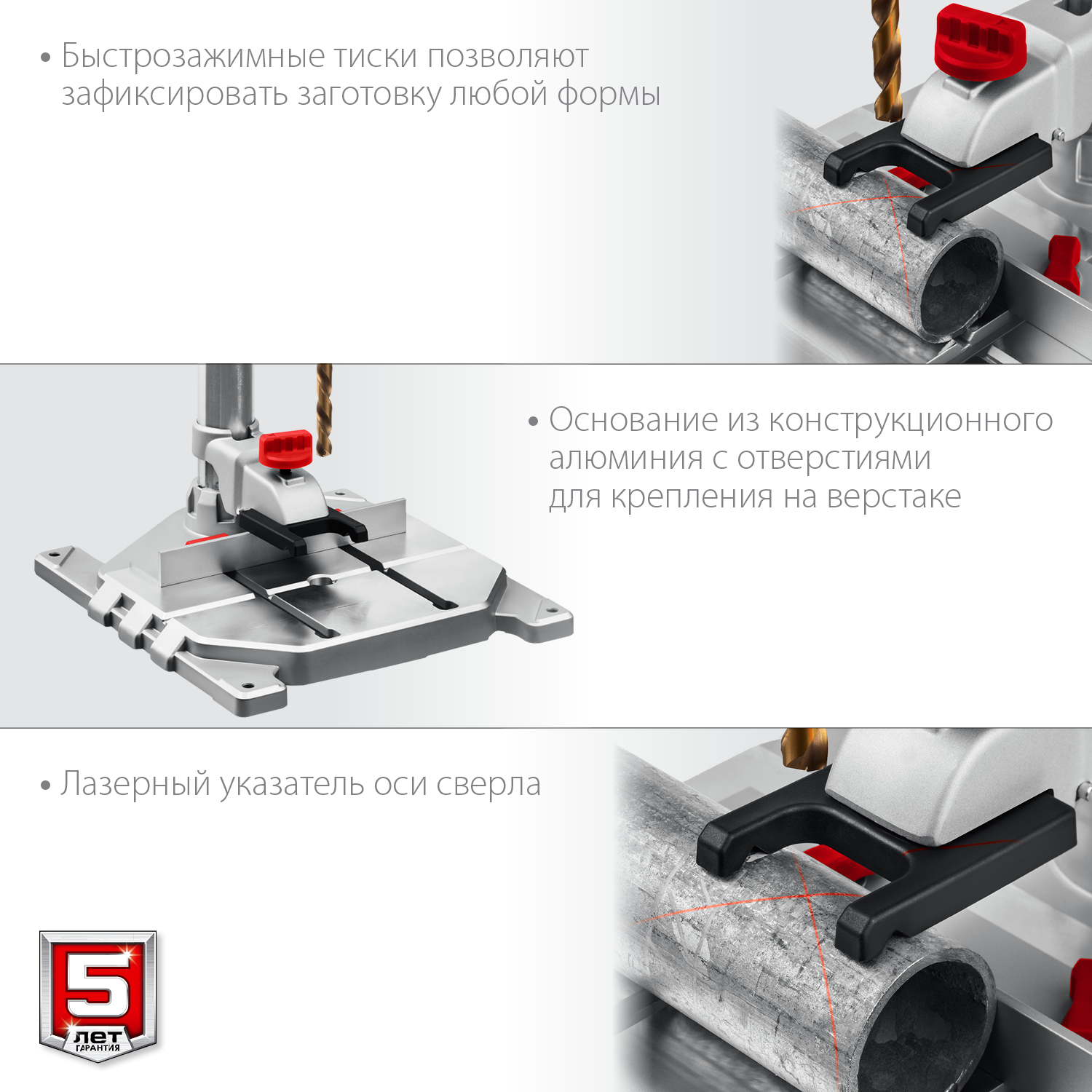 Профессиональный сверлильный станок для точных работ. Быстрое и качественное сверление отверстий в различных материалах (при установке соответствующих типов сверл). Быстрозажимное устройство позволяет надёжно фиксировать даже круглые заготовки, обеспечивая высокую точность выполняемых отверстий. Лазерный указатель точно указывает точку вхождения сверла в материал, обеспечивая быстрое получение точного результата