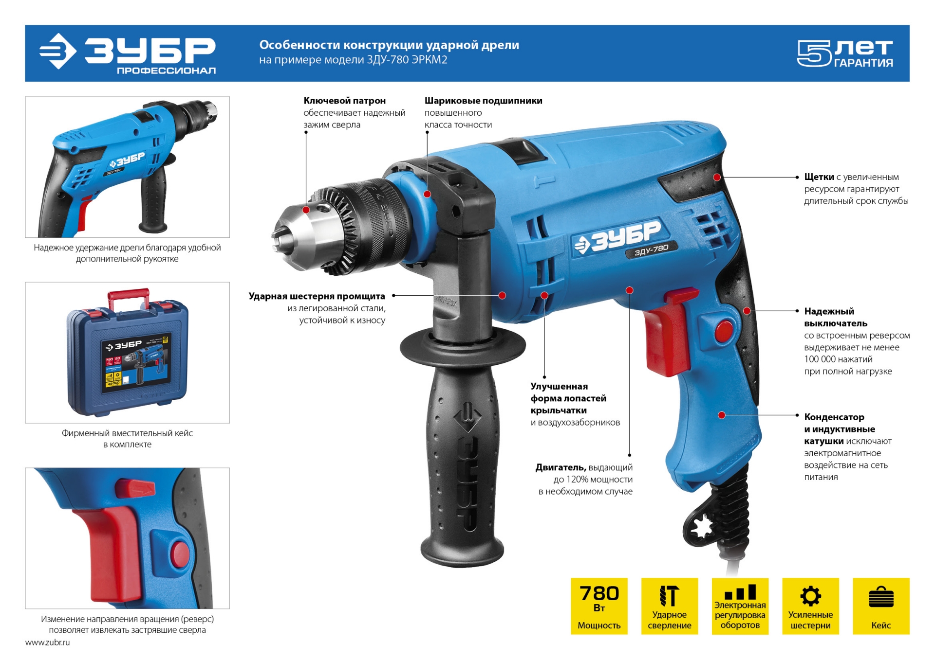 - Изменение направления вращения (реверс) позволяет использовать изделие в качестве шуруповерта