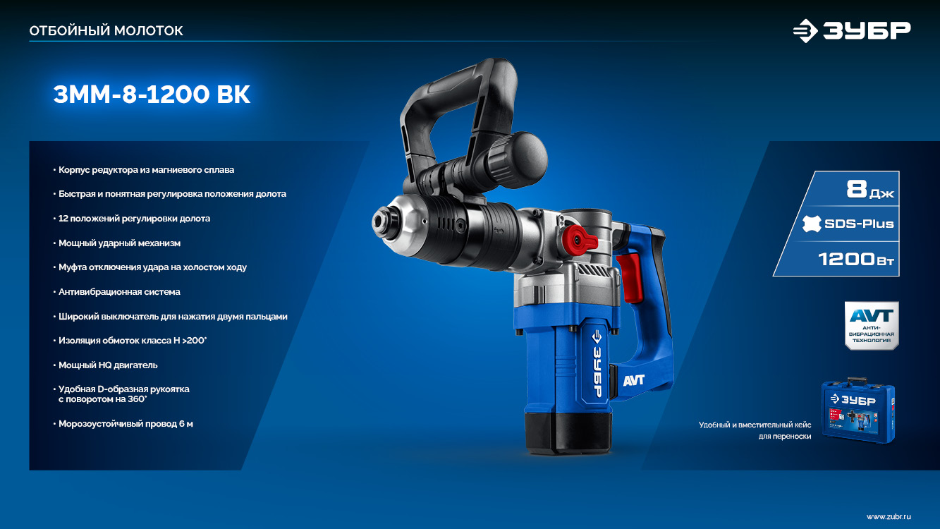 Относительно компактный и надёжный отбойный молоток сочетает в себе небольшой вес и габариты, антивибрационную систему, корпус из магниевого сплава, провод длиной 6 метров, патрон SDS-Plus и энергию удара 8 Дж, которые позволят Вам с лёгкостью справляться с требуемой работой
