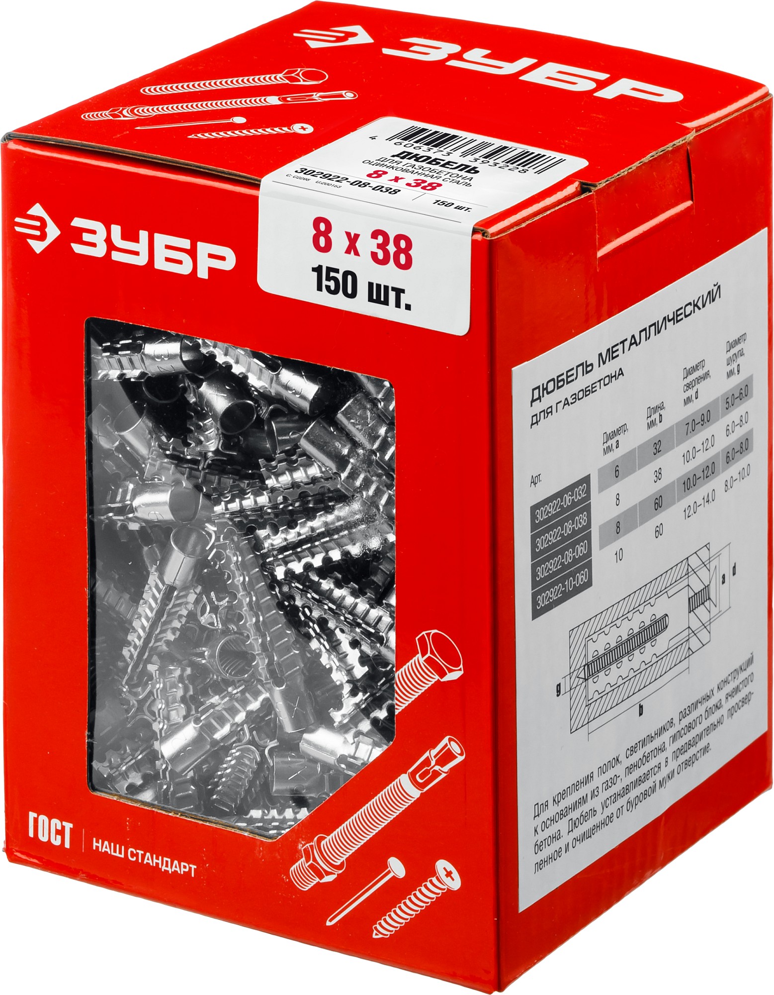 ЗУБР 8 х 38 мм, 150 шт, металлический дюбель для газобетона (302922-08-038)