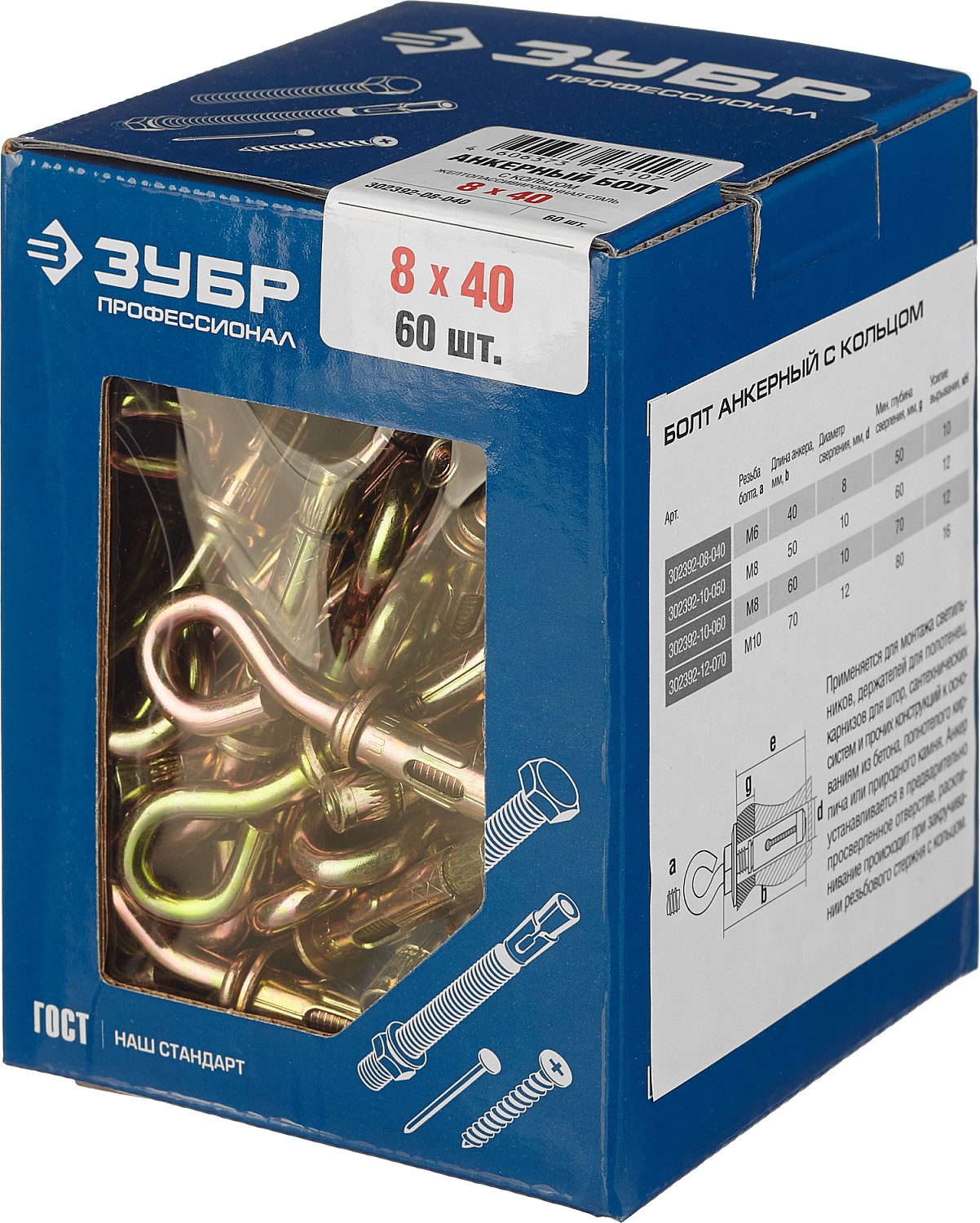 ЗУБР 8 х 40 мм, 60 шт, анкерный болт с кольцом, Профессионал (302392-08-040)