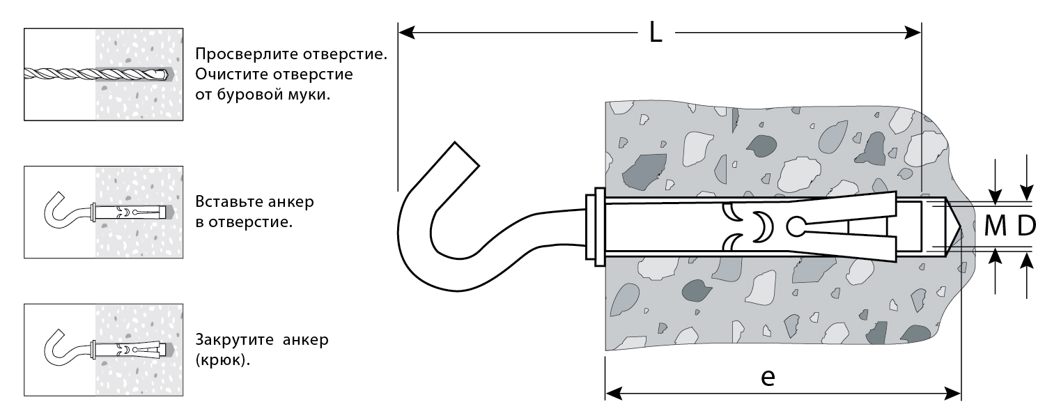 Для монтажа конструкций к полнотелым основаниям: поверхностям из бетона, полнотелого кирпича или природного камня. Анкер устанавливается в предварительно просверленное и очищенное от буровой муки отверстие и расклинивается при закручивании резьбового стержня