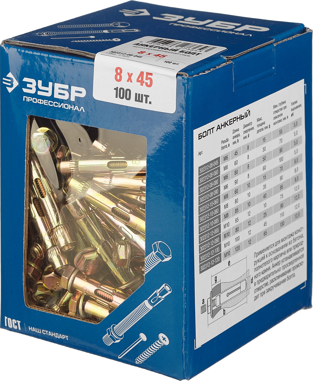 ЗУБР 8 х 45 мм, 100 шт, анкерный болт, Профессионал (302312-08-045)