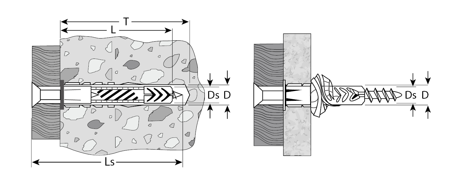 Для монтажа элементов и конструкций к полнотелым (бетон, кирпич, природный камень), пустотелым (кирпичи с пустотами, блоки и т.п.) и тонкостенным (фанера, ДСП, гипсокартон и т.п.) строительным материалам. Фиксация дюбеля происходит при вкручивании в него самореза (входит в комплект поставки). Диаметр предварительного сверления: 8 мм.