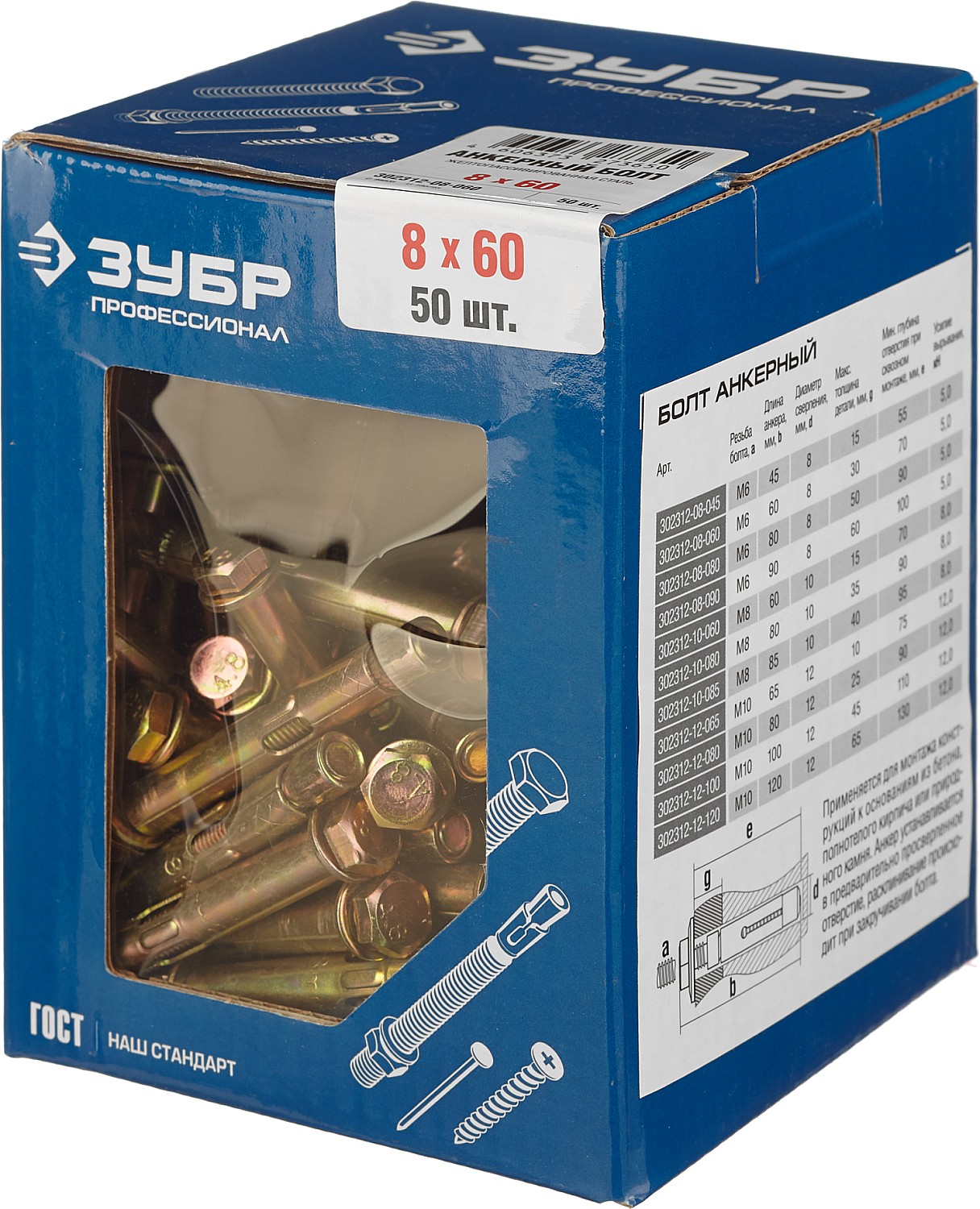 ЗУБР 8 х 60 мм, 50 шт, анкерный болт, Профессионал (302312-08-060)