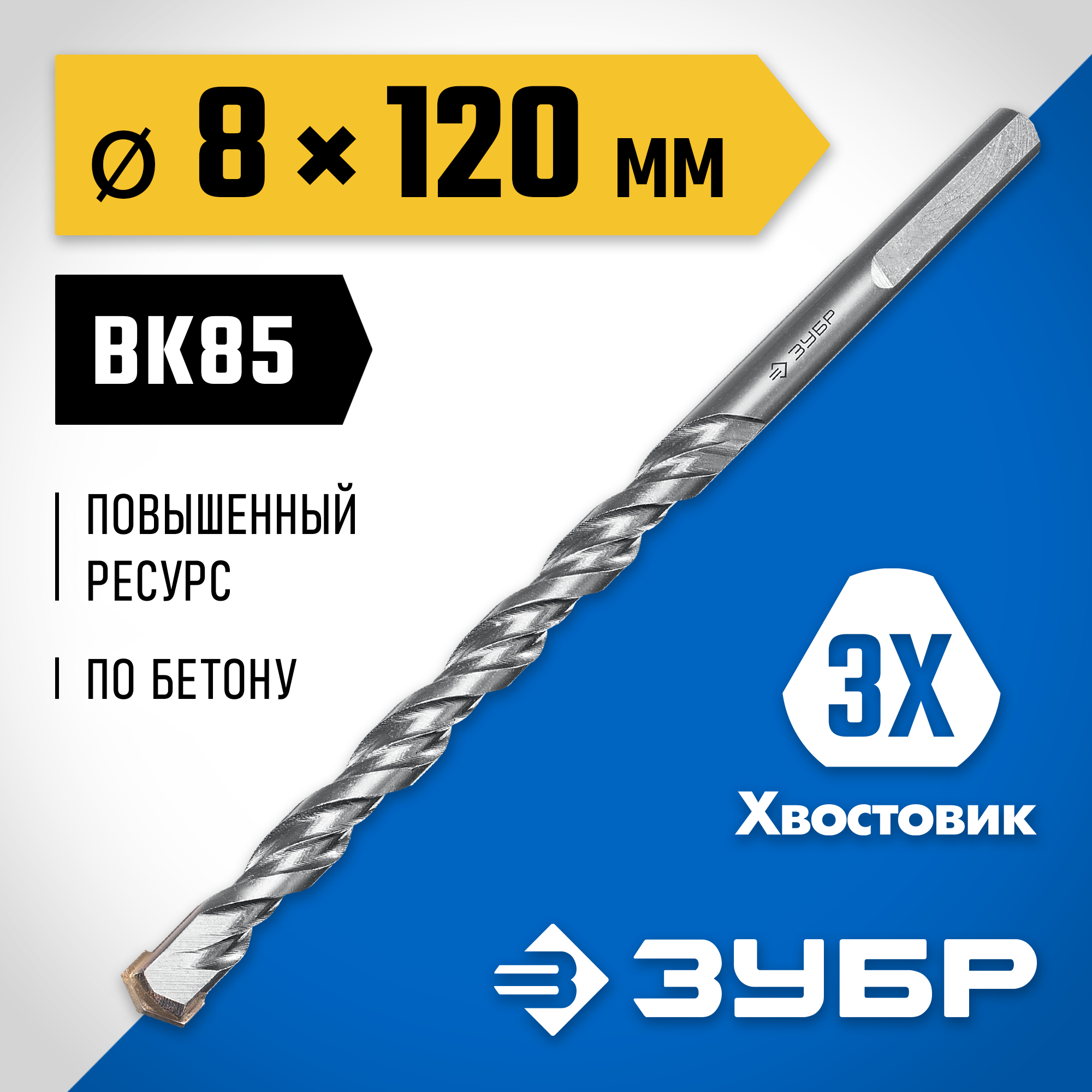 ЗУБР 8 x 120 мм, трехгранный хвостовик, сверло по бетону усиленное, Профессионал (2916-120-08)