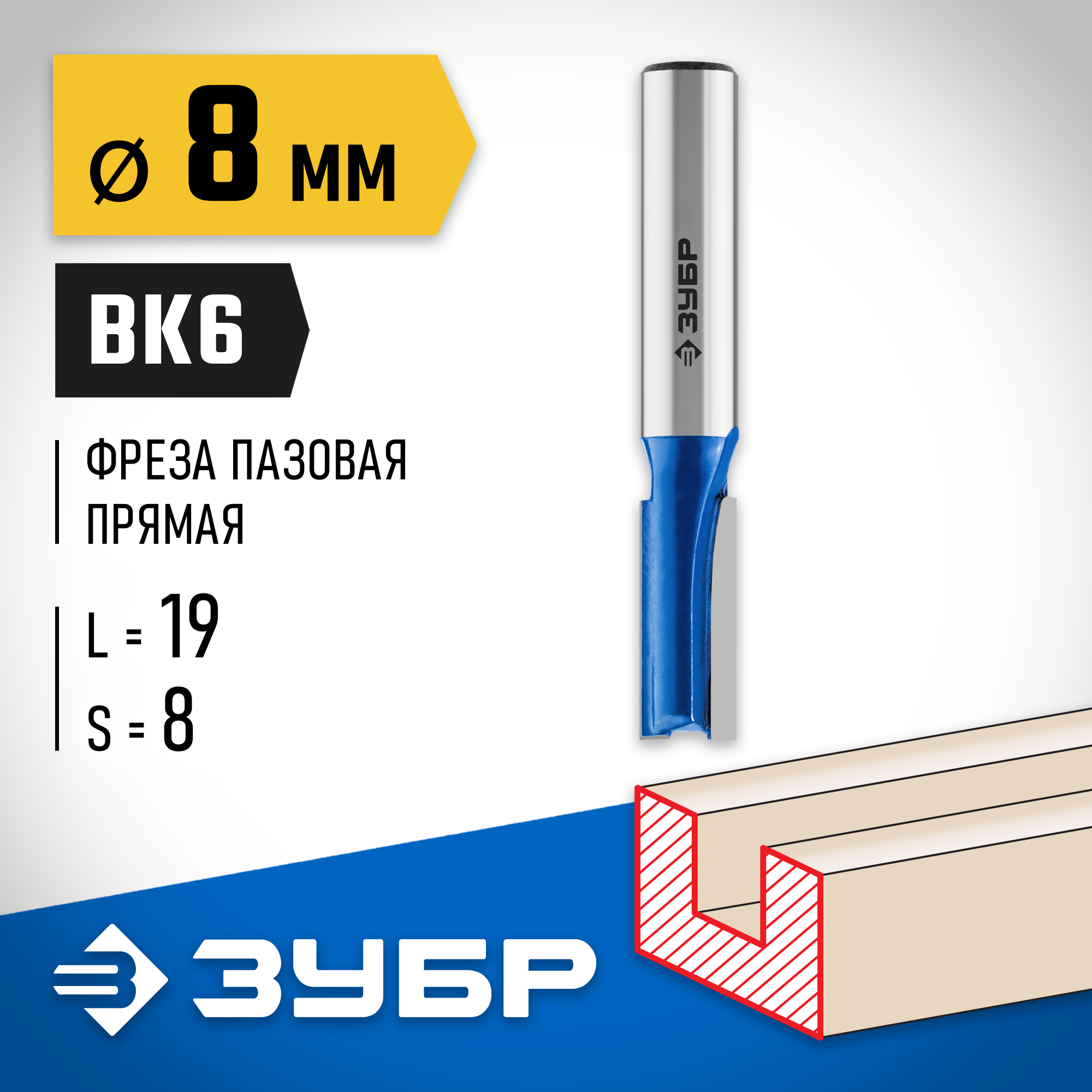 ЗУБР 8 x 19 мм, хвостовик 8 мм, фреза пазовая прямая, Профессионал (28753-8-19)
