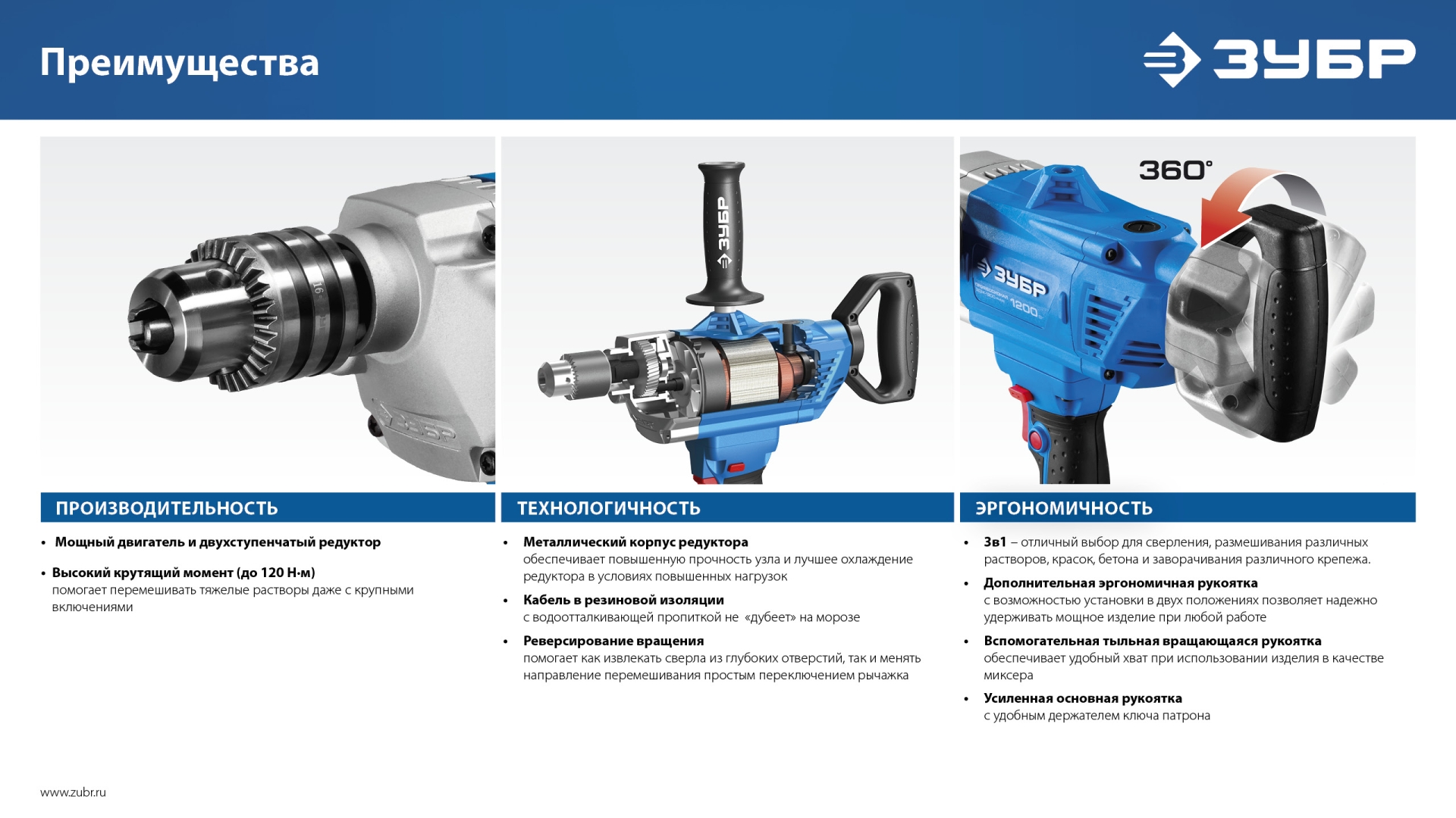 - Реверсирование вращения помогает как извлекать сверла из глубоких отверстий, так и менять направление перемешивания простым переключением рычажка