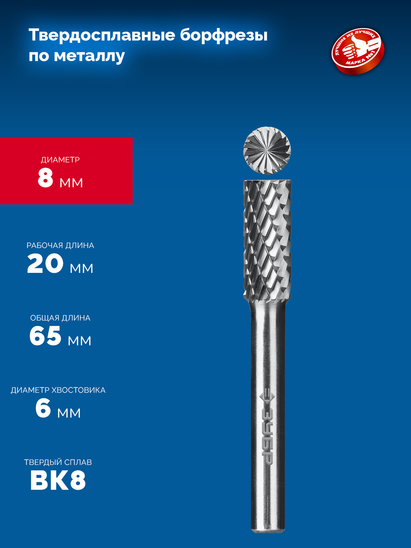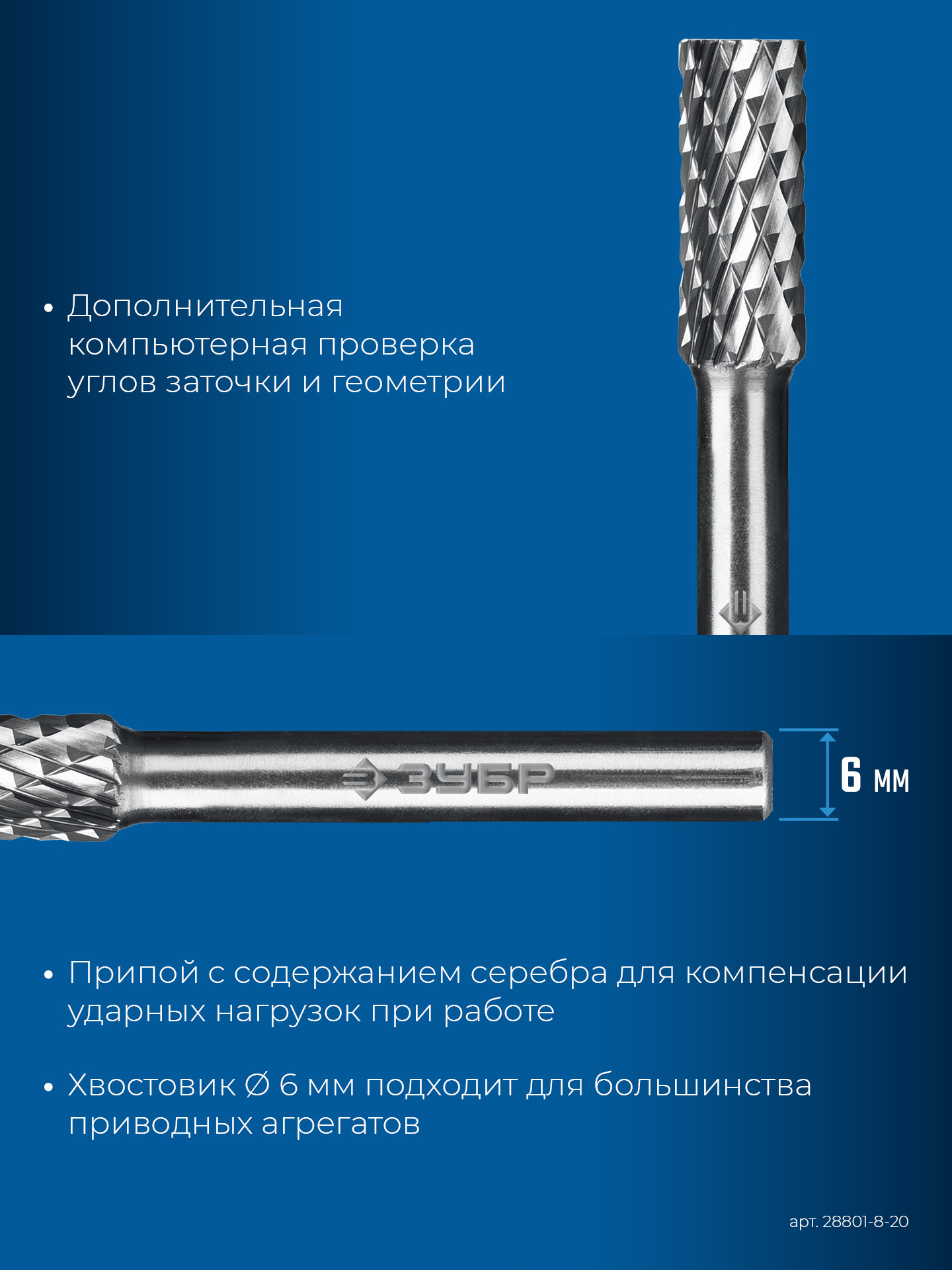 ЗУБР 8х20 мм, тип B (цилиндр с торцевыми зубьями), хв-к 6 мм, твердосплавная борфреза, ПРОФЕССИОНАЛ (28801-8-20)