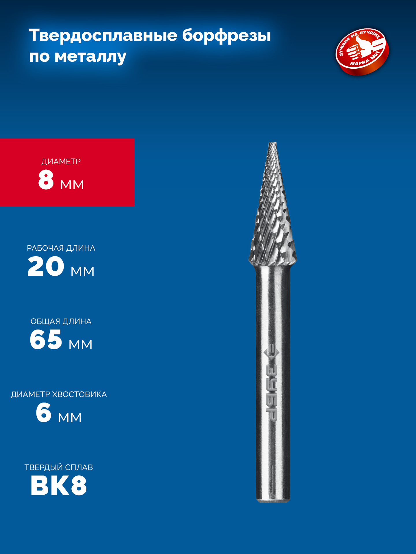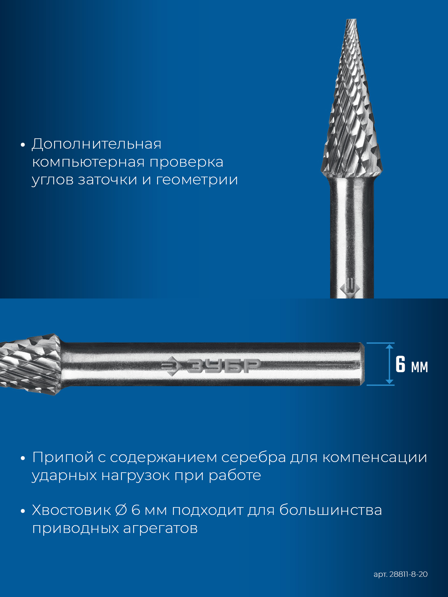 ЗУБР 8х20 мм, тип M (конус с острым углом 14°), хв-к 6 мм, твердосплавная борфреза, ПРОФЕССИОНАЛ (28811-8-20)
