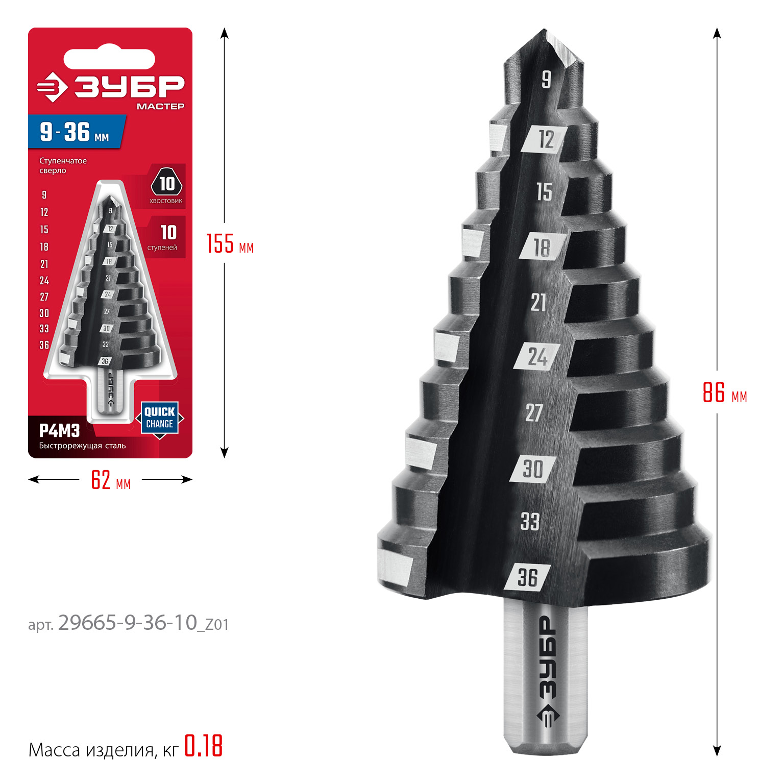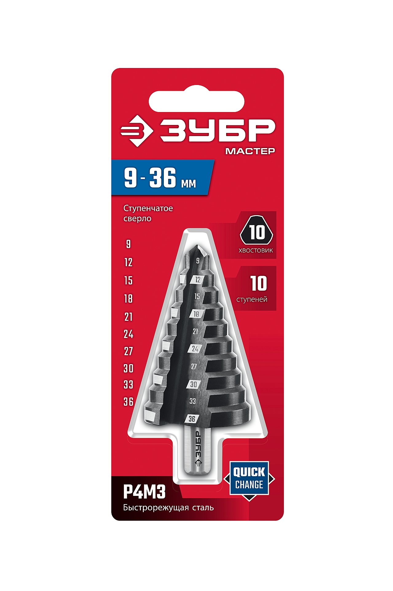ЗУБР 9-36мм, 10 ступеней, сверло ступенчатое (29665-9-36-10)