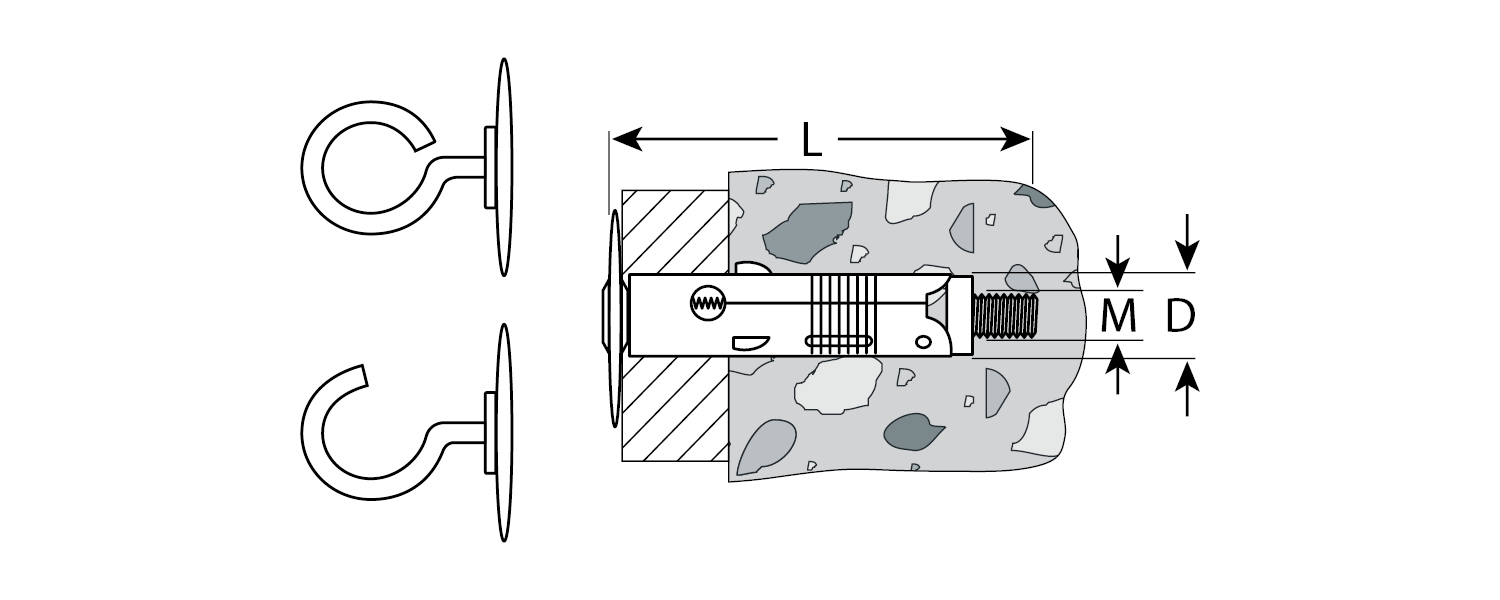 Для крепления проушин, тросов, цепей, подвесных конструкций к полнотелым основаниям: поверхностям из бетона, полнотелого кирпича или природного камня. Анкер устанавливается в предварительно просверленное и очищенное от буровой муки отверстие диаметром 8мм и глубиной не менее 55мм, расклинивание происходит при закручивании полукольца с резьбовым стержнем