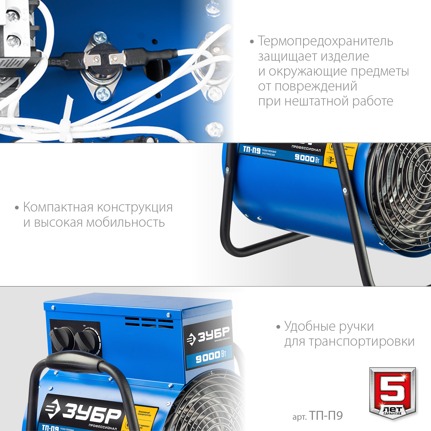 Профессиональные электрические тепловые пушки с питанием от трехфазной электрической сети эффективны для быстрого и направленного обогрева складских и производственных помещений, ангаров и мастерских, благодаря большой площади нагревательных элементов и мощным двигателем вентилятора. Надёжная доработанная конструкци,обеспечивают защиту как пользователя, так и тепловой пушки в случае возникновения нештатных ситуаций. Сделано в России