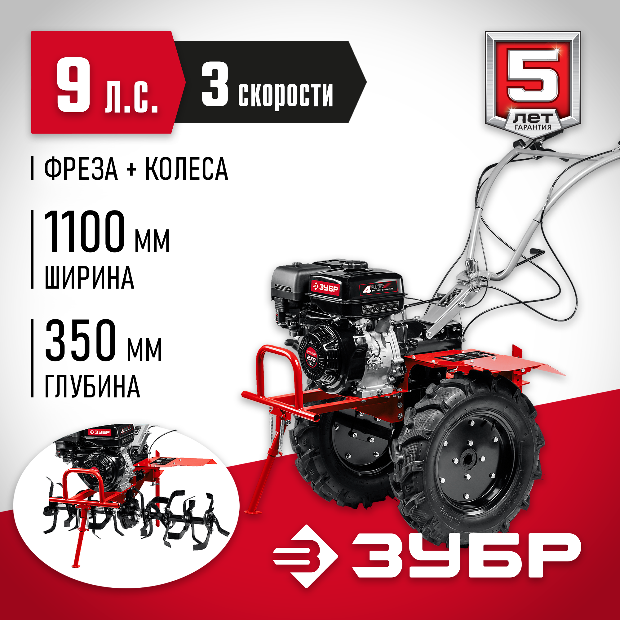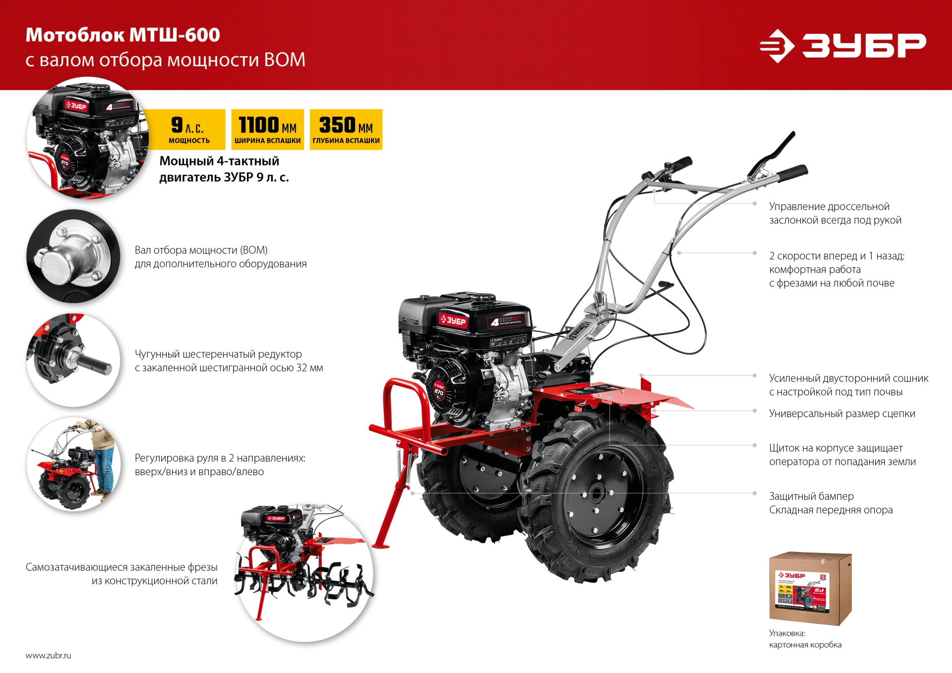 - 2 скорости вперед (понижающая, основная) и 1 назад позволяют комфортно работать на любых типах почвы