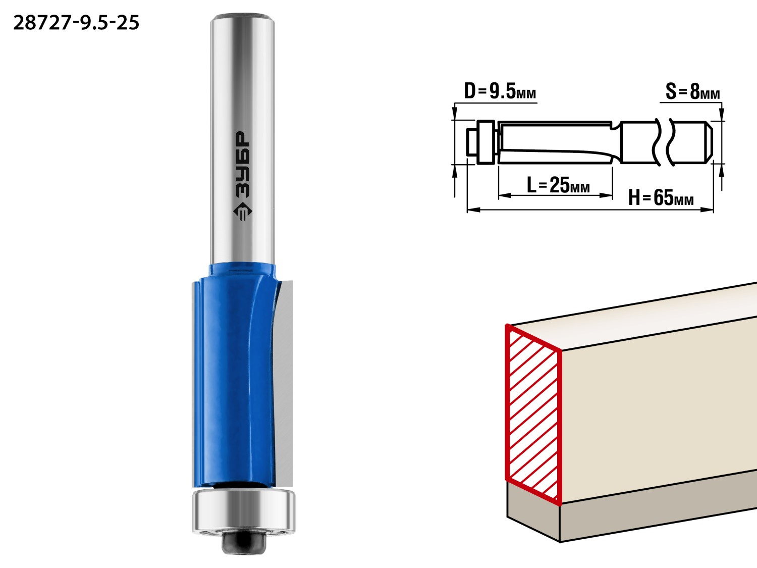 ЗУБР 9.5 x 25 мм, хвостовик 8 мм, фреза кромочная с нижним подшипником, Профессионал (28727-9.5-25)